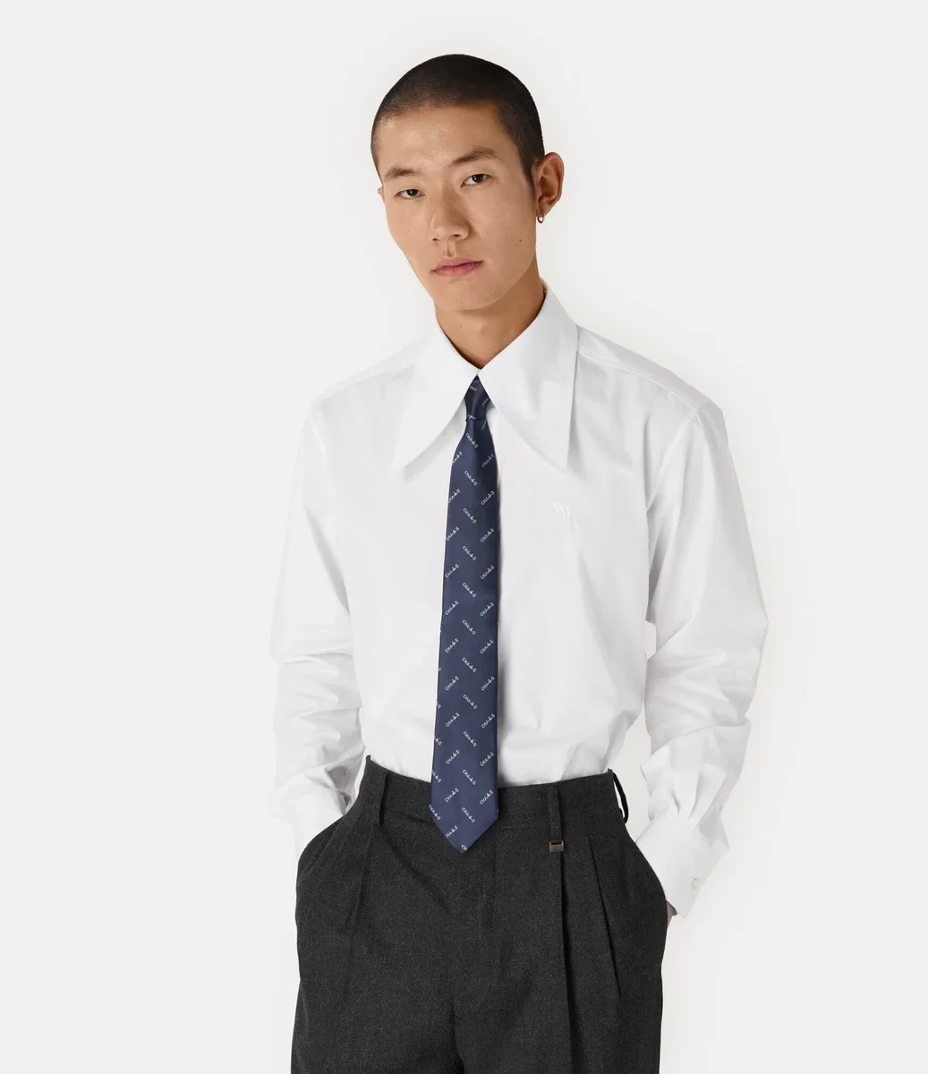 Cravata noastră din mătase are o lamă lată care se îngustează până la un vârf clasic ascuțit. Designul este completat de sloganul „CHAOS”, semnătura casei, repetat pe toată suprafața, care surprinde spiritul rebel al lui Vivienne și angajamentul ei de a sfida convențiile politice.