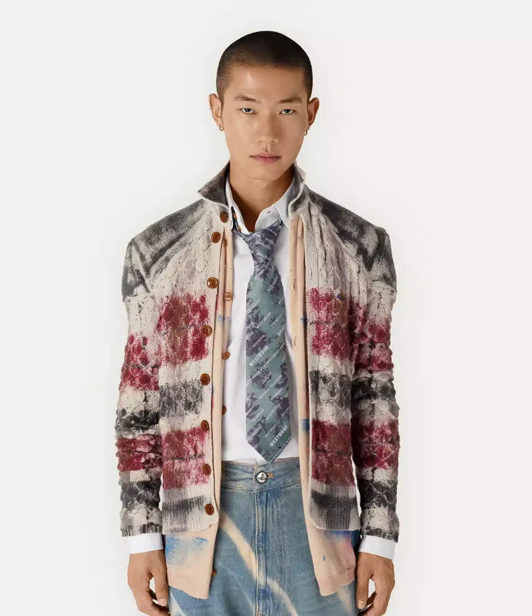 Cravata noastră are imprimeul caracteristic Toile de Jouy, oferind un motiv pastoral romantic pe toată suprafața. Croită cu o lamă largă care se îngustează spre un vârf clasic ascuțit, piesa este finisată cu un motiv îndrăzneț cu litere „Westwood” repetate pe toată silueta în fonturi variate.p>