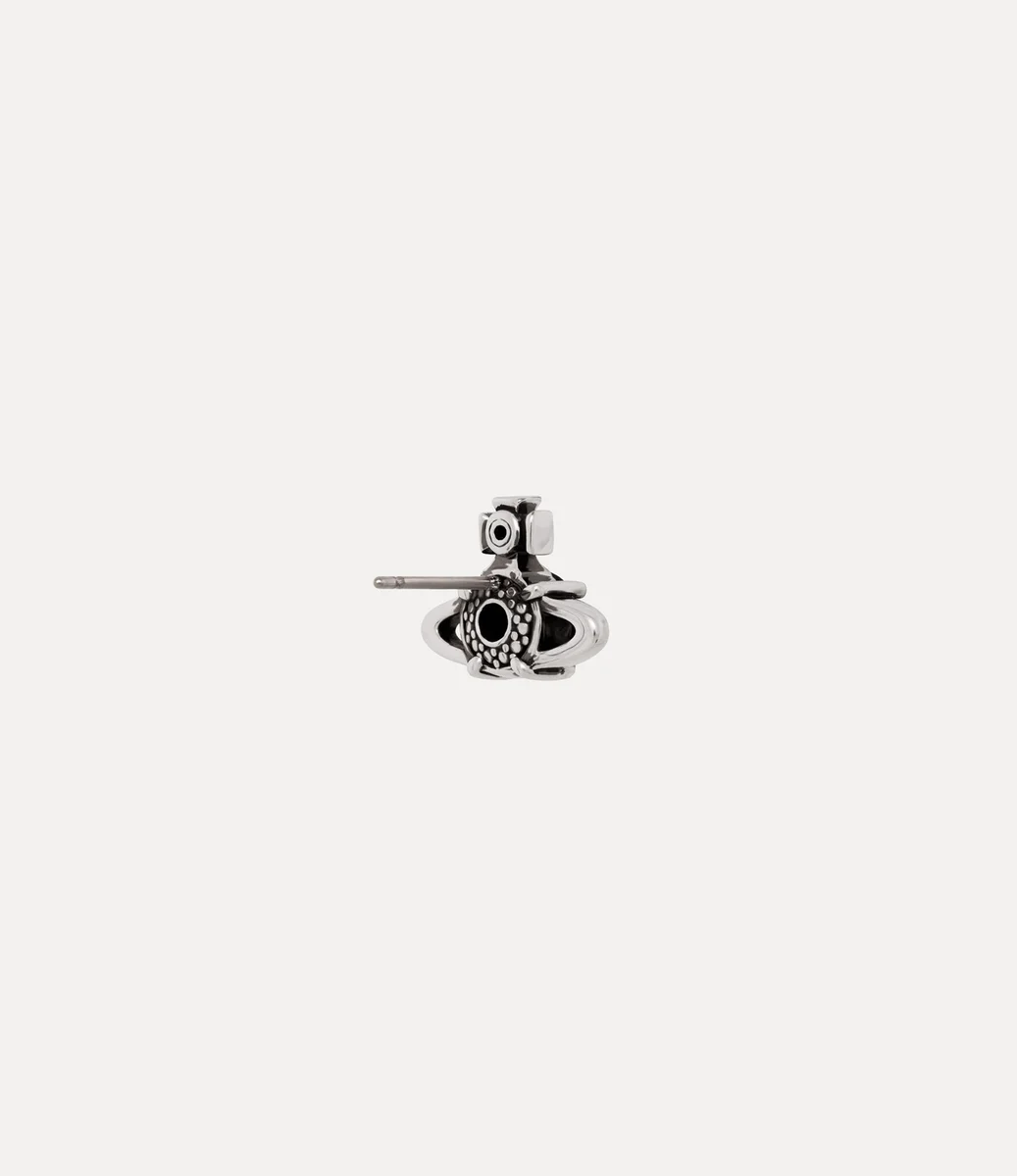 Cerceii Man. Reina Single Stud, marca noastră distinctivă, sunt realizați din metal argintiu cu finisaj oxidat, pentru un efect antic. Designul este completat de o piatră prețioasă neagră, tăiată rotund, în centrul sferei și a crucii, reflectând viziunea Viviennei de a lansa tradiția în viitor.