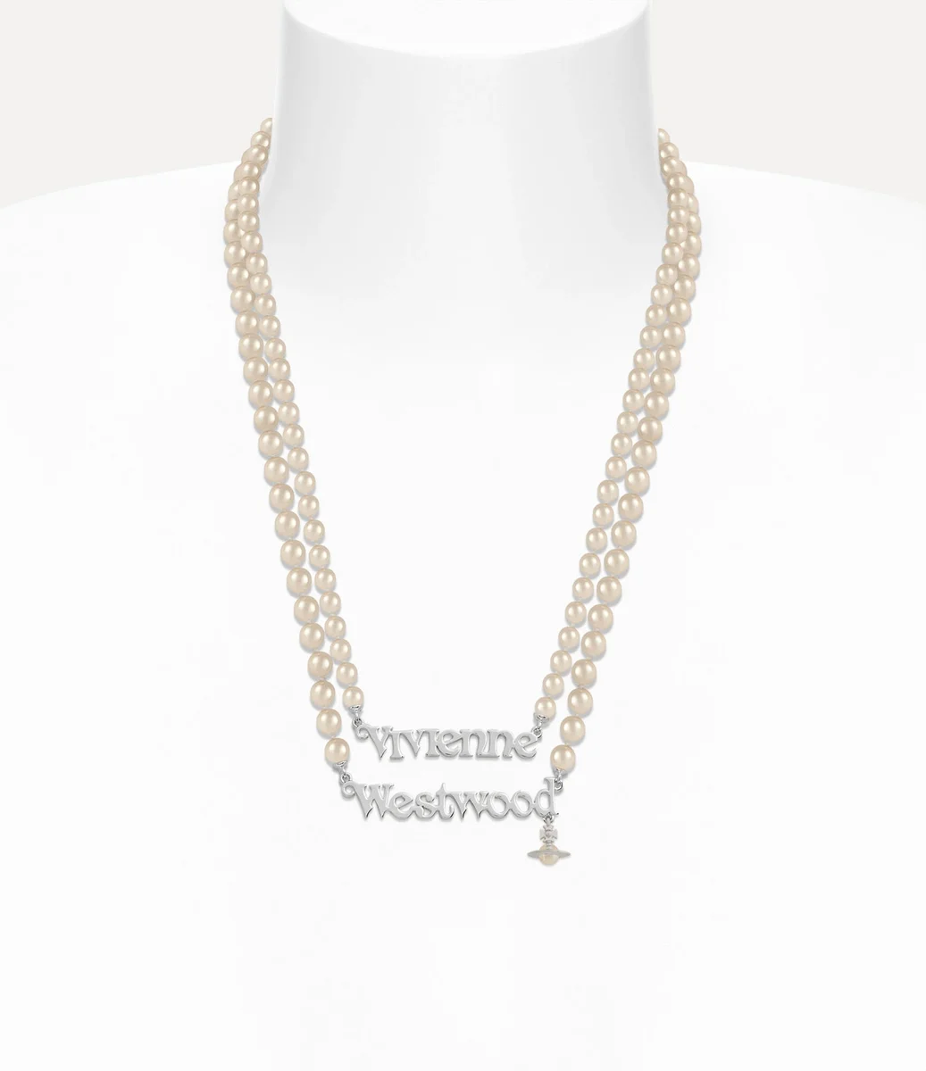 Colierul nostru Man. Emilio, de culoare argintie, are două rânduri de perle Swarovski strălucitoare, care evocă un sentiment de măreție și lux. În centru, designul prezintă motivul cu litere „Vivienne Westwood”, de care este suspendat un pandantiv în formă de glob cu perle.