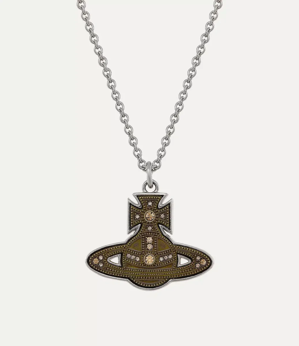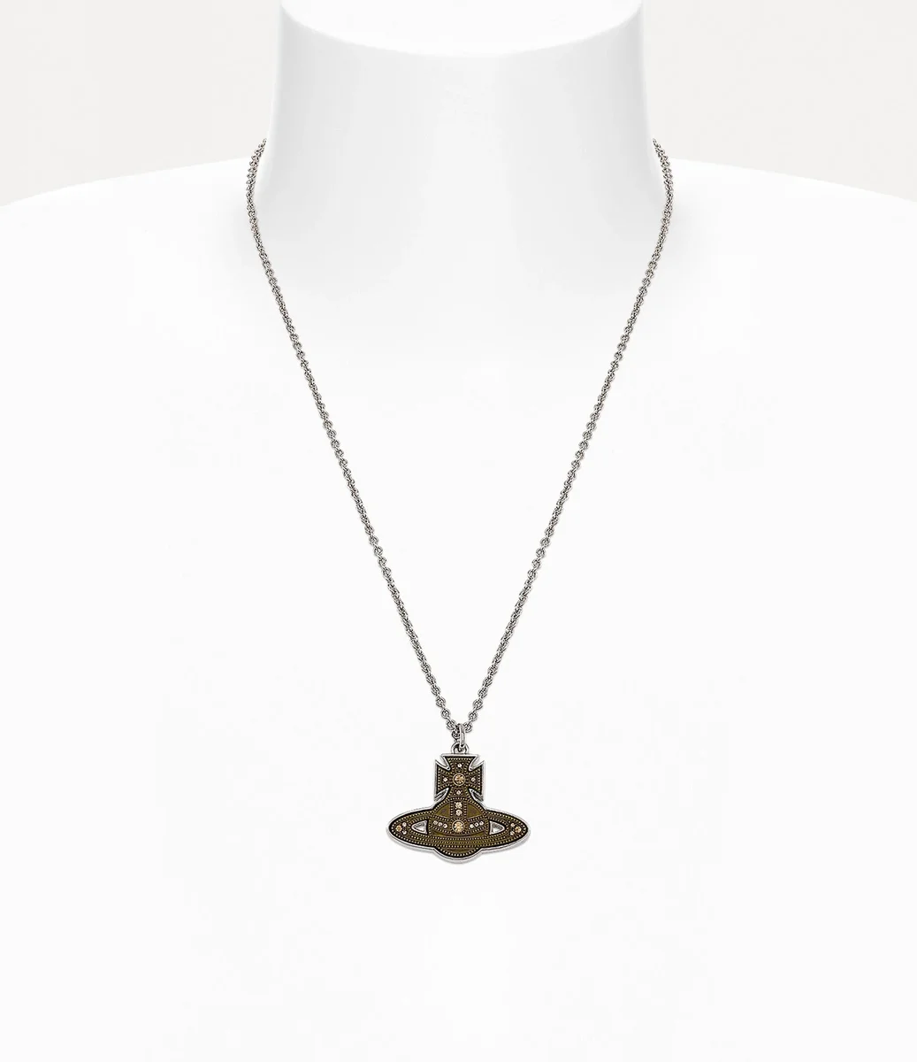 Colierul cu pandantiv Laszlo din colecția Our Man are în centrul designului un motiv în formă de glob, completat de un finisaj din alamă oxidată pentru un aspect antic. Designul prezintă o suprafață texturată, completată de detalii din cristal care pun în valoare inelul Saturn, hamul și partea superioară în formă de cruce.