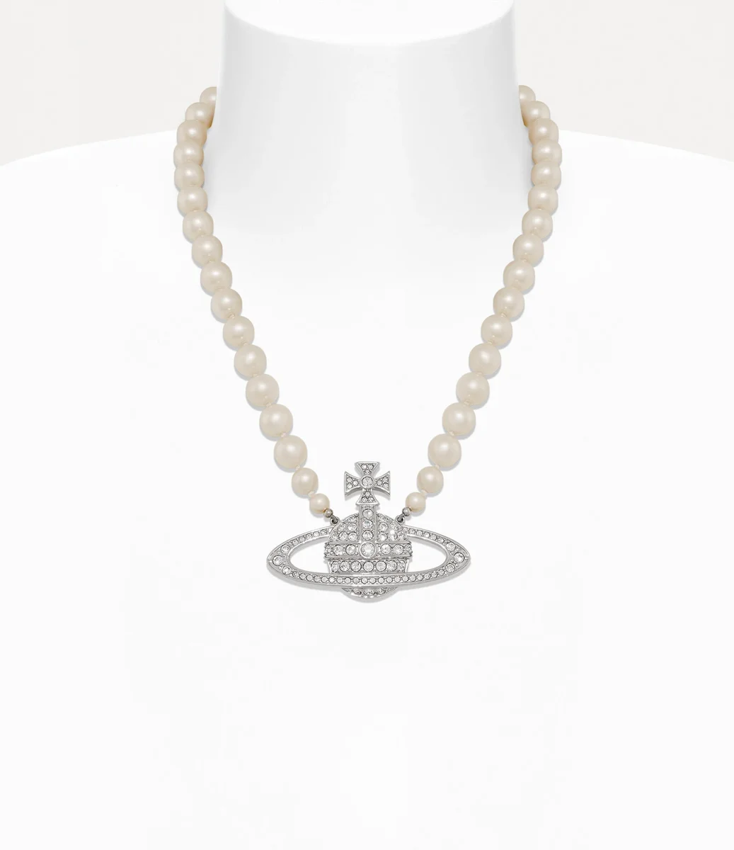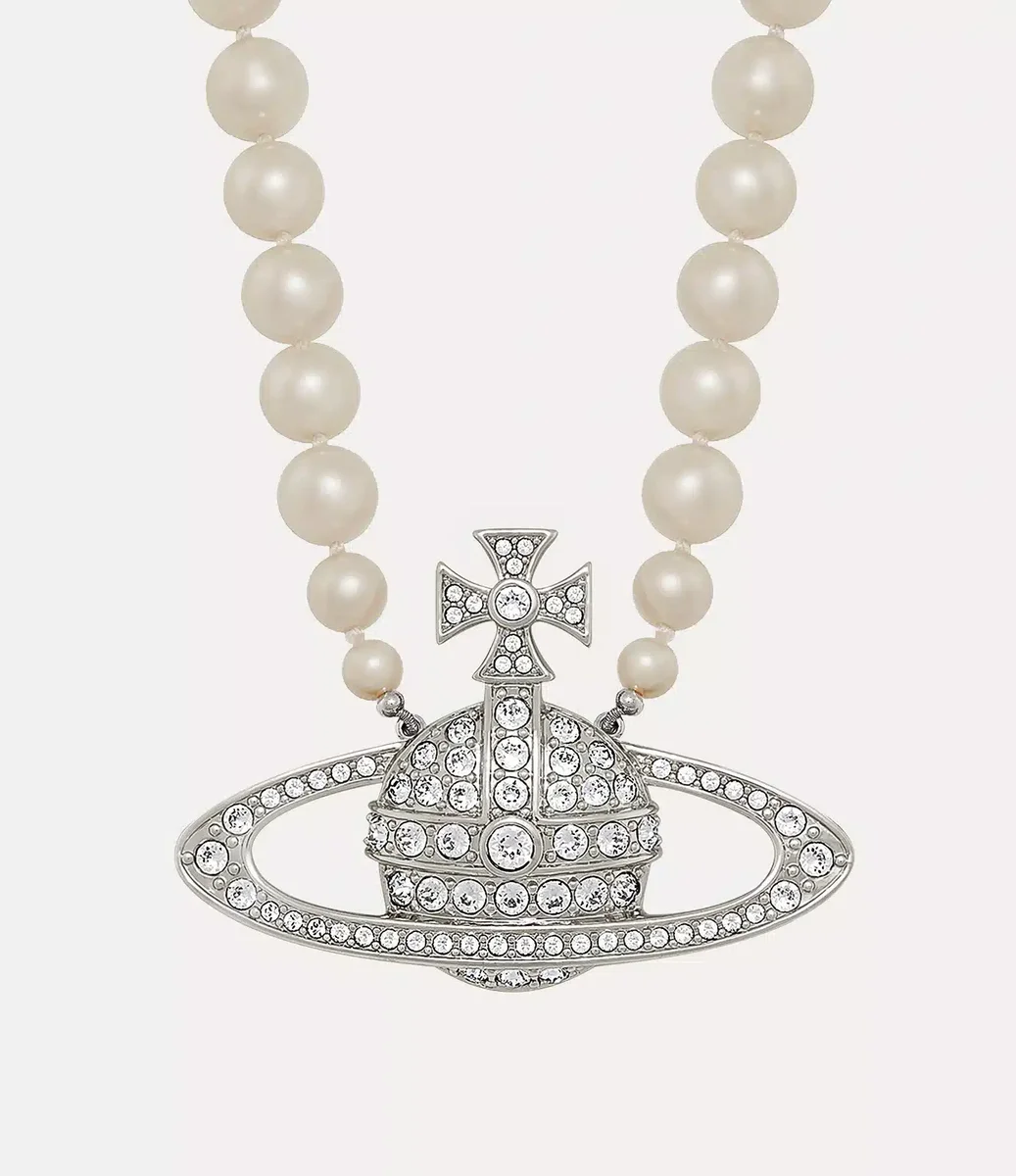 Perlele sunt esențiale pentru moștenirea casei, evocând un sentiment de lux de altădată. Colierul nostru Man. Bas Relief Pearl prezintă un șir de perle Swarovski înnodate manual, cu dimensiuni elegante, completate cu un motiv sferic împodobit cu cristale în centrul designului – sinonim cu viziunea Viviennei de a lansa tradiția în viitor.