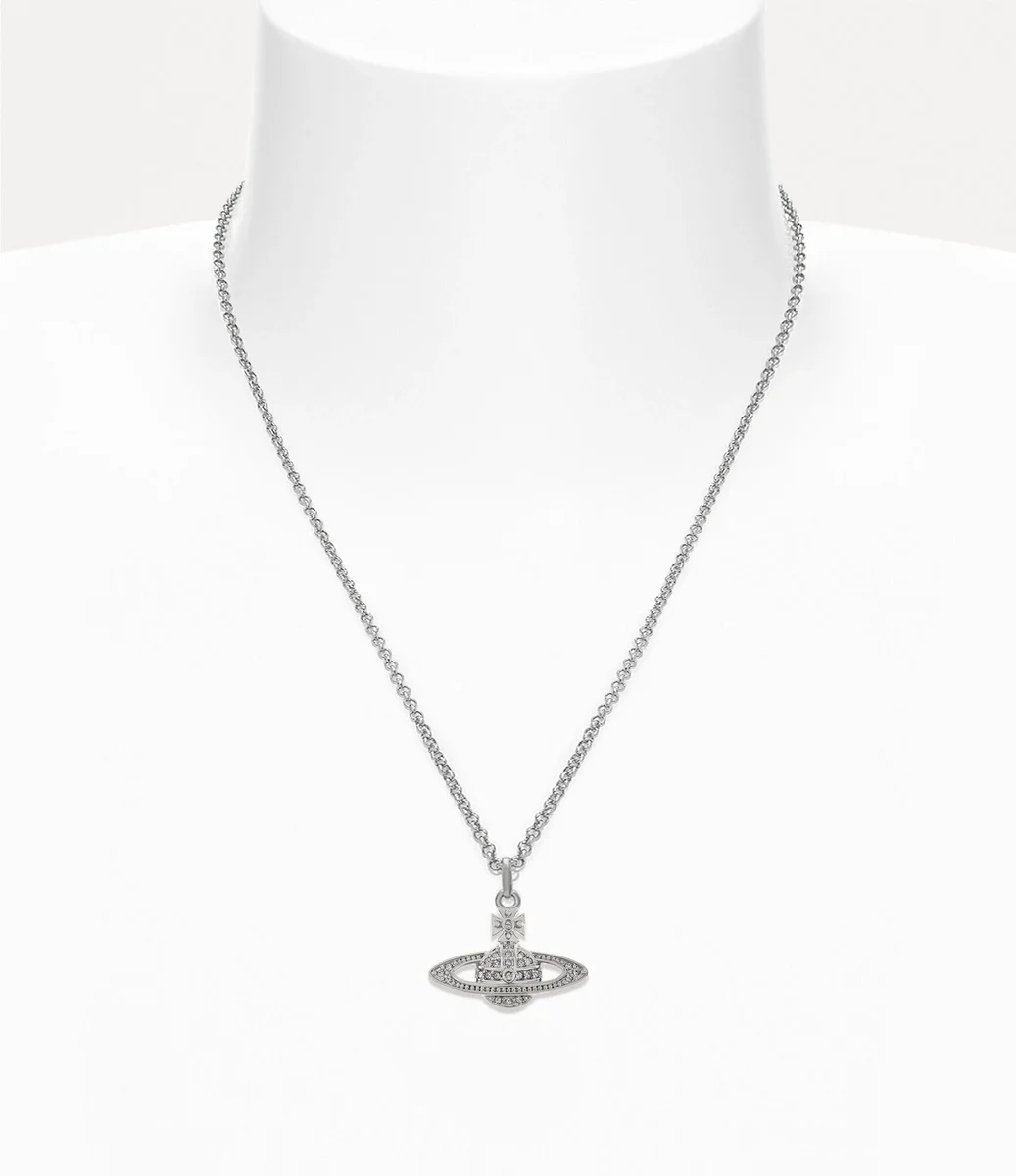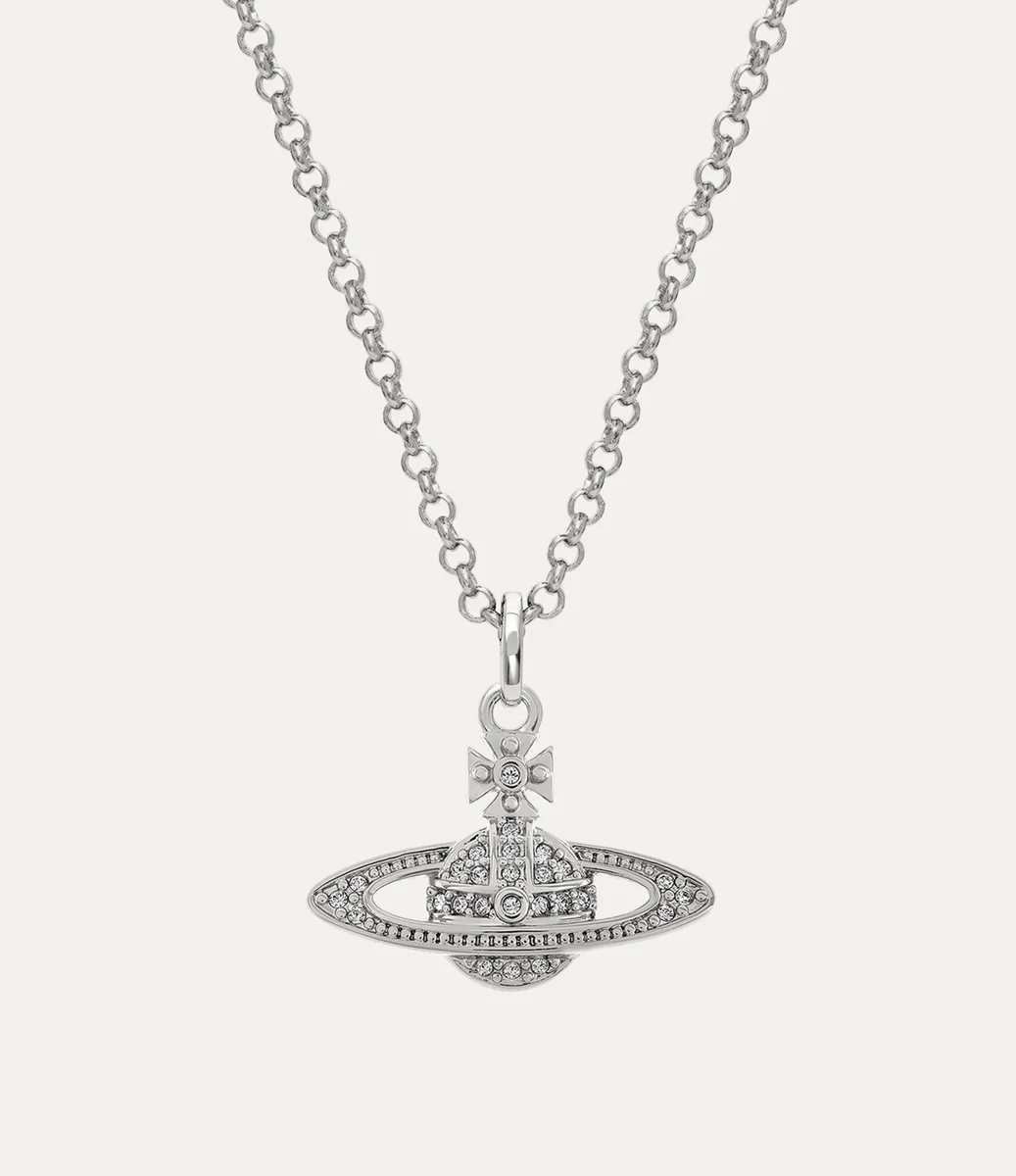 Silueta globului casei este sinonimă cu viziunea Viviennei de a duce tradiția în viitor. Colierul Man. Mini Bas Relief Orb Pendant are forma unui glob, împodobit cu detalii din cristale albe și placat cu argint.