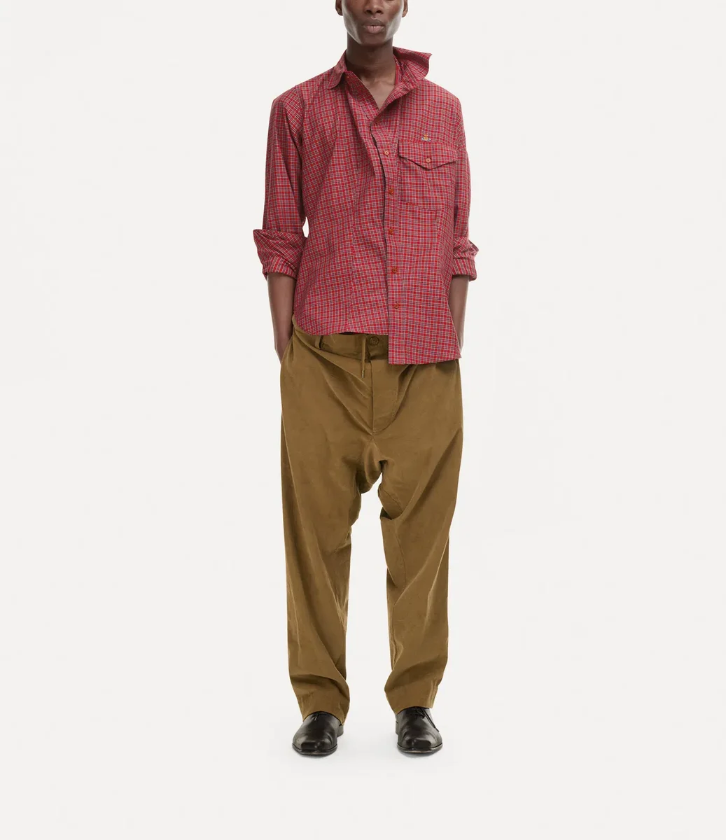 Cămașa Chaos reia sistemul experimental de croială „Drunken” al Vivienne, caracterizat prin tiv asimetric și o placketă descentrată. Confecționată într-un motiv tartan vibrant, designul este finisat cu broderii multicolore în formă de glob.