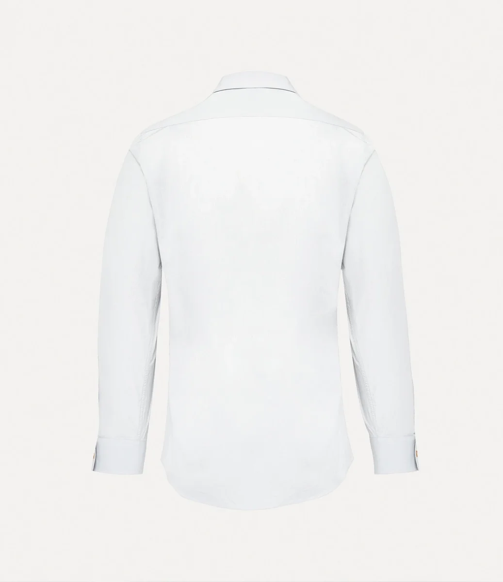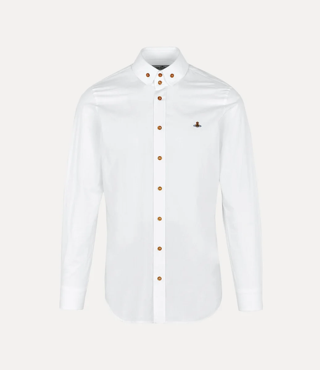 Silueta cămășii Krall cu două nasturi se inspiră dintr-un model de arhivă, având gulerul iconic cu două nasturi al Vivienne. Piesa prezintă broderia noastră caracteristică în formă de glob pe partea stângă a pieptului – sinonimă cu viziunea Vivienne de a lansa tradiția în viitor.
