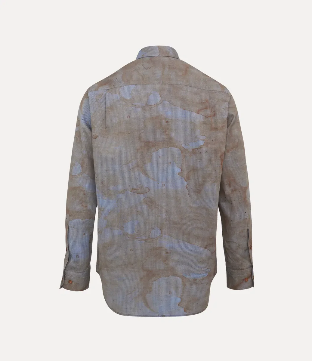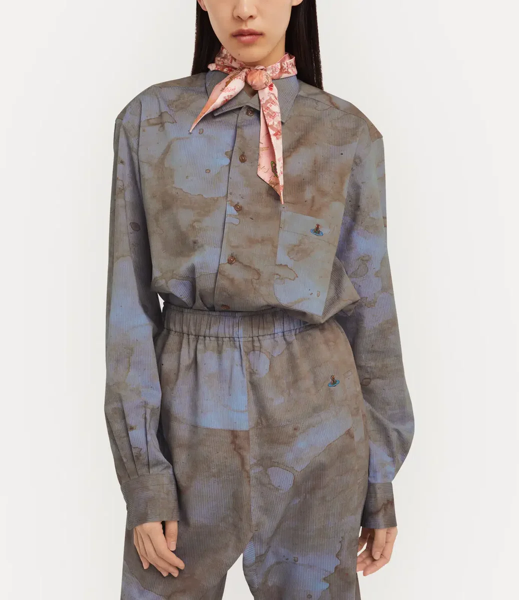 Cămașa noastră PJ este decorată cu detalii pictate manual, care amintesc de aspectul pictural al imprimeurilor „Grass Stain” și „Wine Stain” din arhiva casei. Prezentată cu guler ascuțit și nasturi în față, silueta este completată de un buzunar la piept, brodat cu emblema orb semnătură.