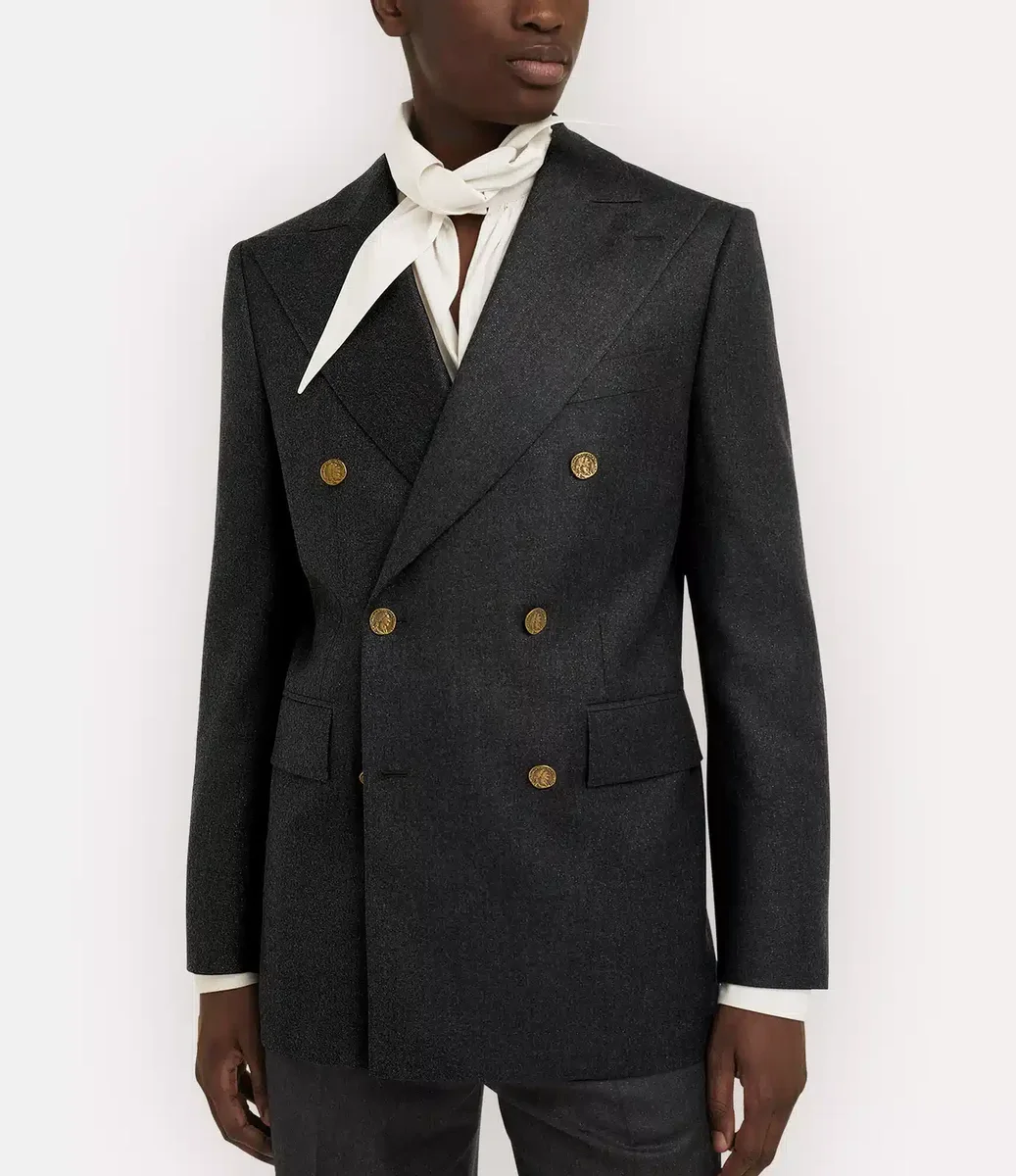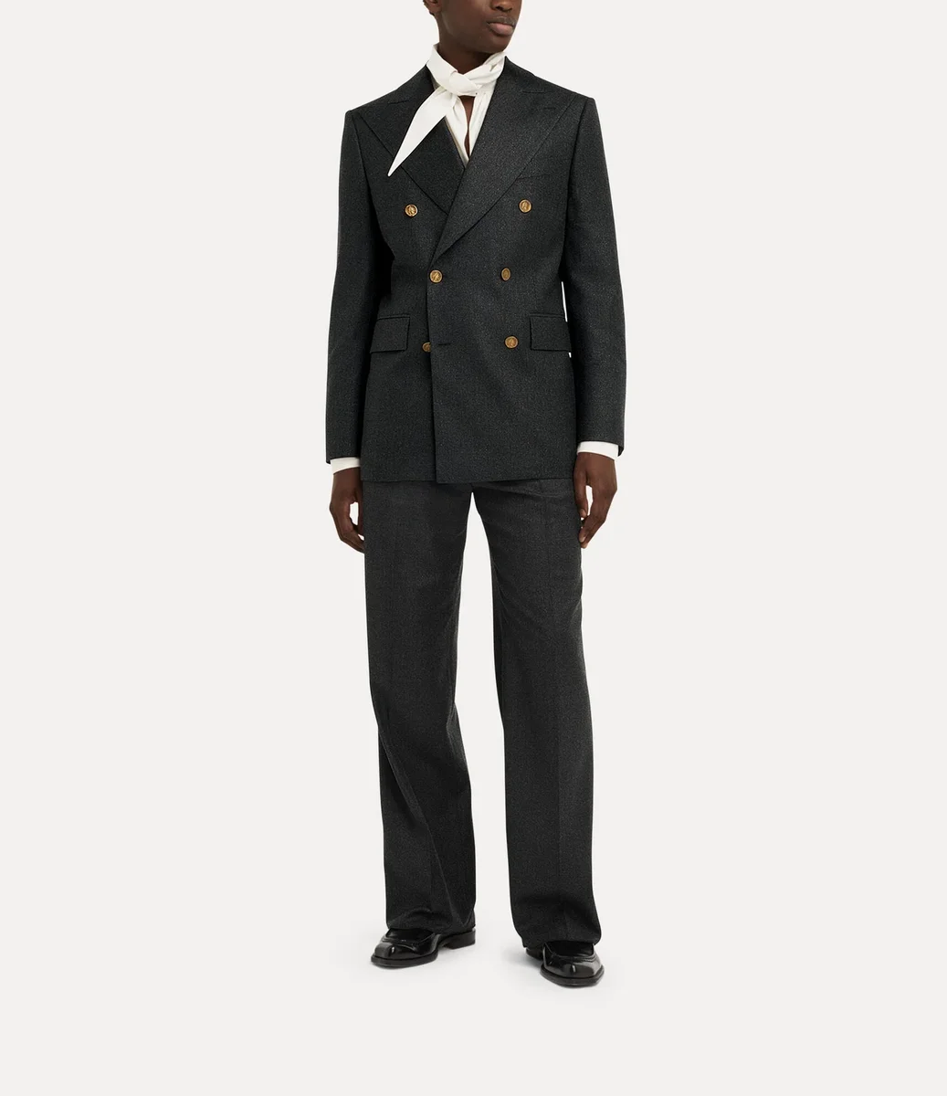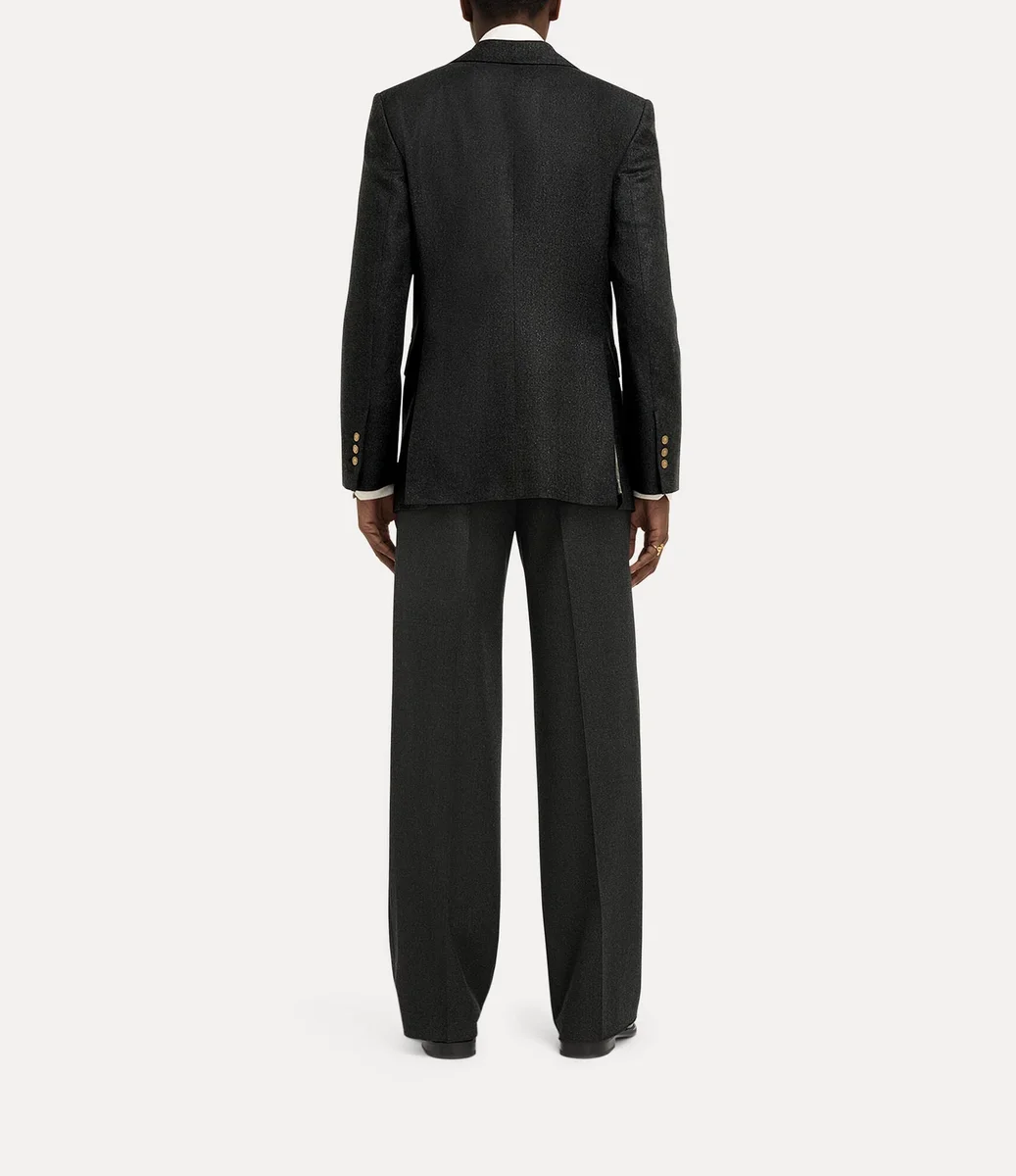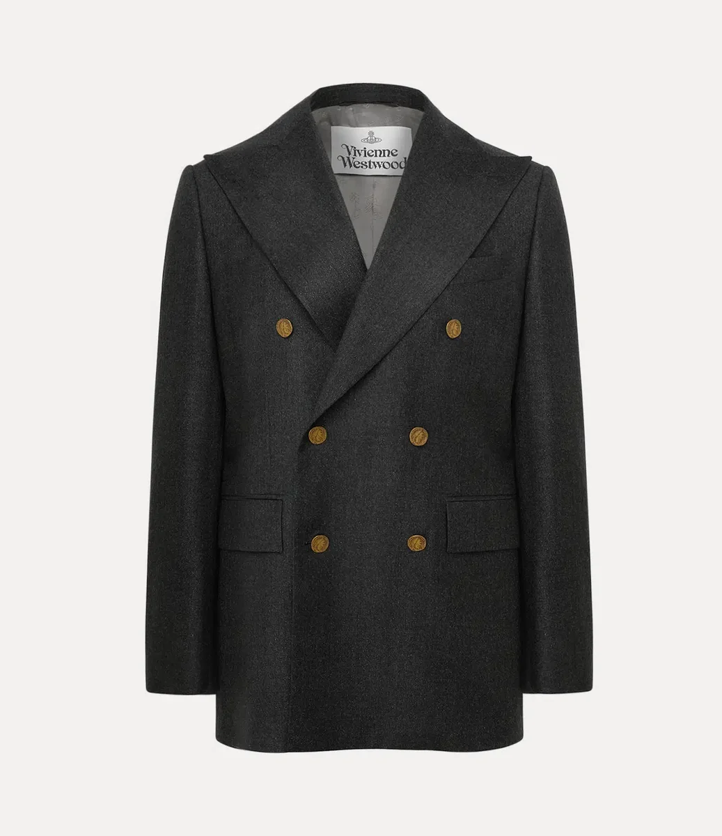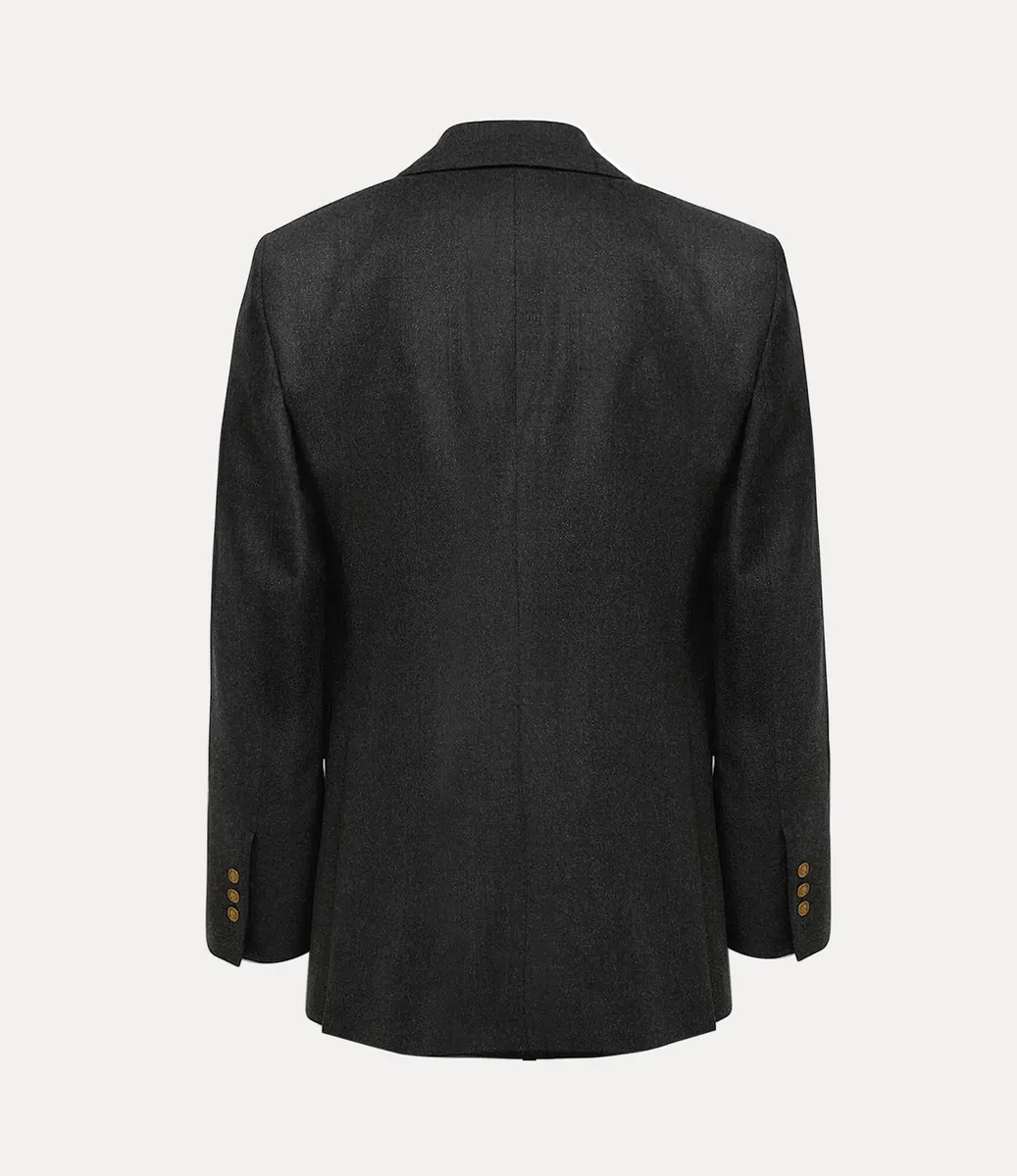 Jacheta noastră Captain are un profil din lână, țesută delicat, cu un finisaj metalic periat. Încadrată de revere ascuțite, silueta cade într-o linie curată, cu fante în spate, completată de căptușeala interioară „Tossed Orb” – sinonimă cu viziunea Viviennei de a lansa tradiția în viitor.