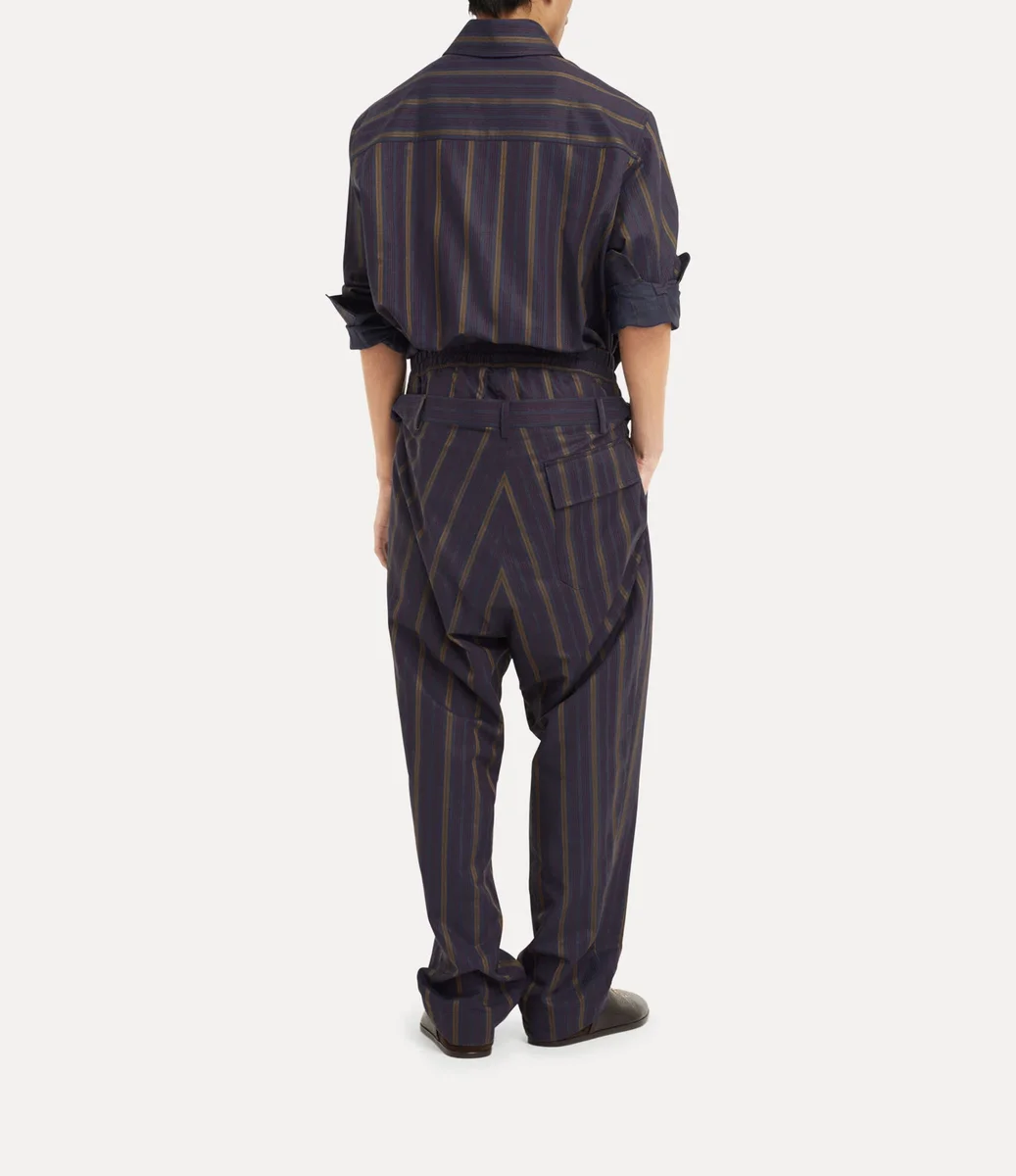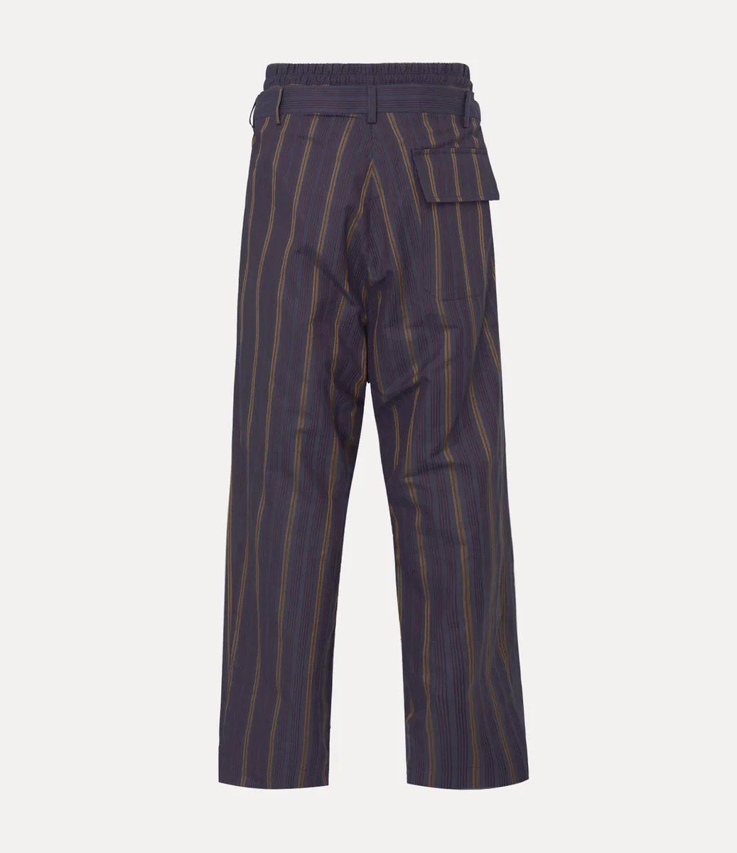 Pantalonii Builder revin în acest sezon într-o versiune din bumbac cu dungi, cu un detaliu brodat pe șold. Cu o talie dublă distinctivă, designul utilizează sistemul experimental de croială „Builder” al Vivienne, introdus pentru prima dată în colecția toamnă-iarnă 2014-2015, „Save the Rainforest”.