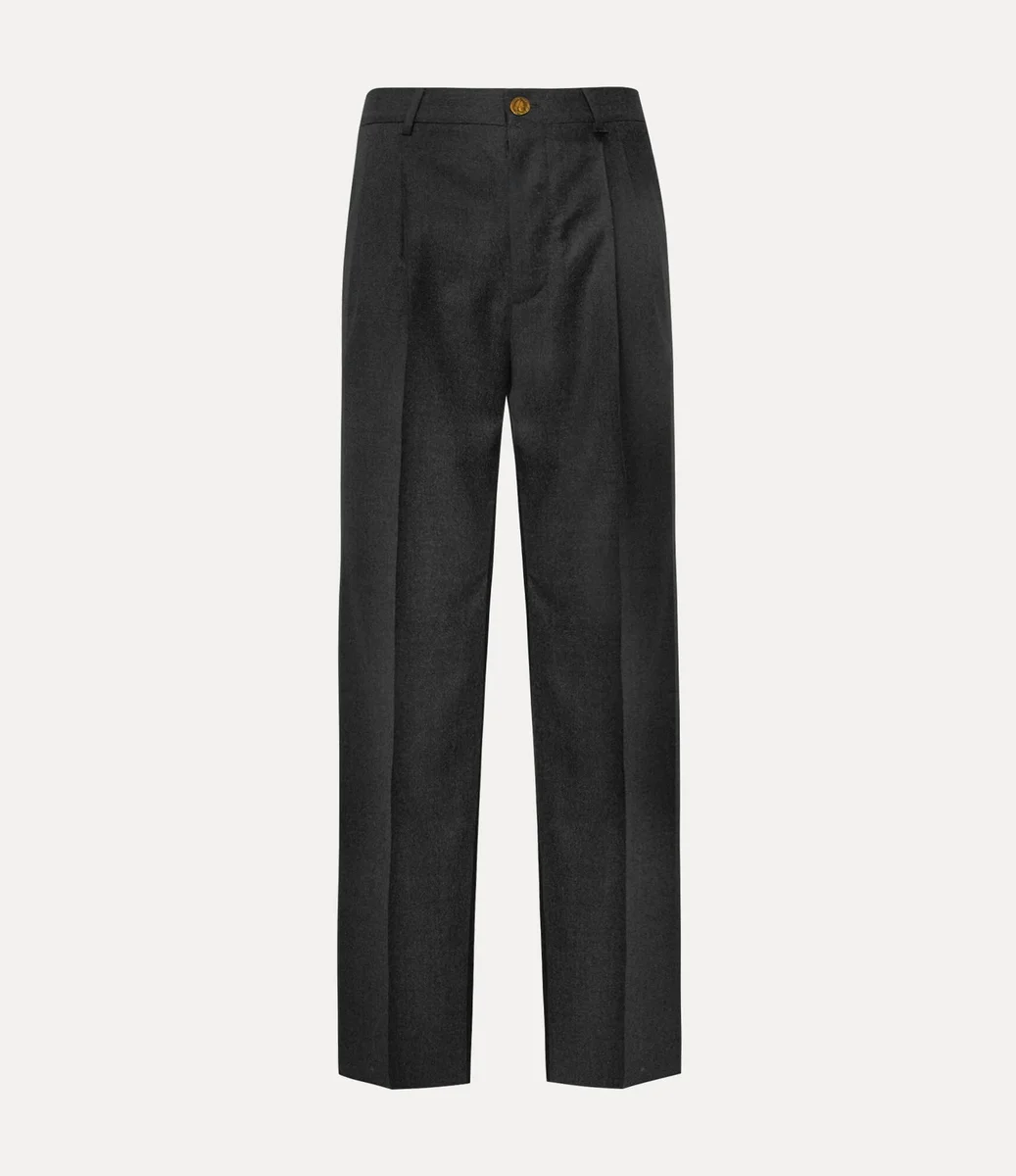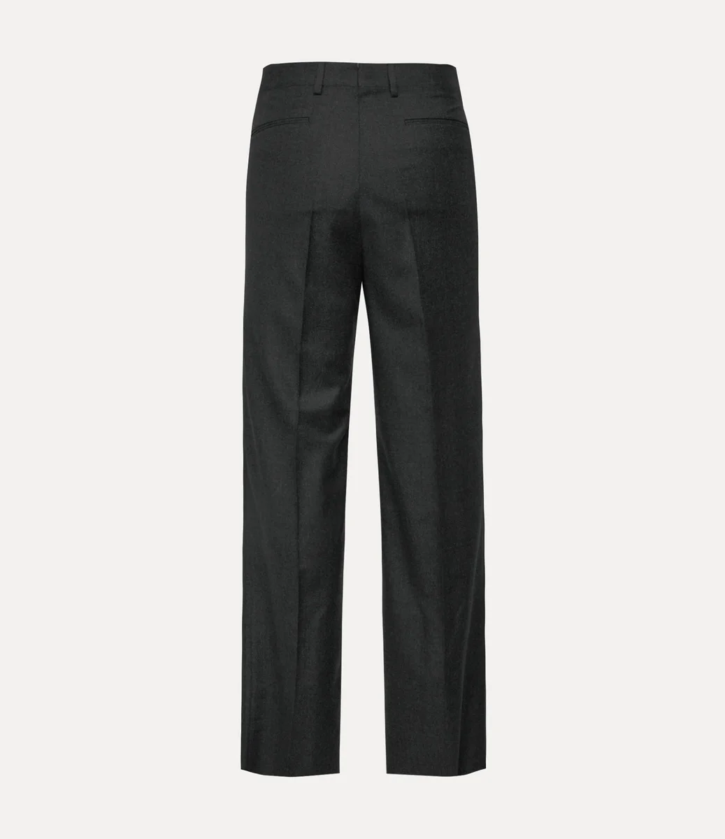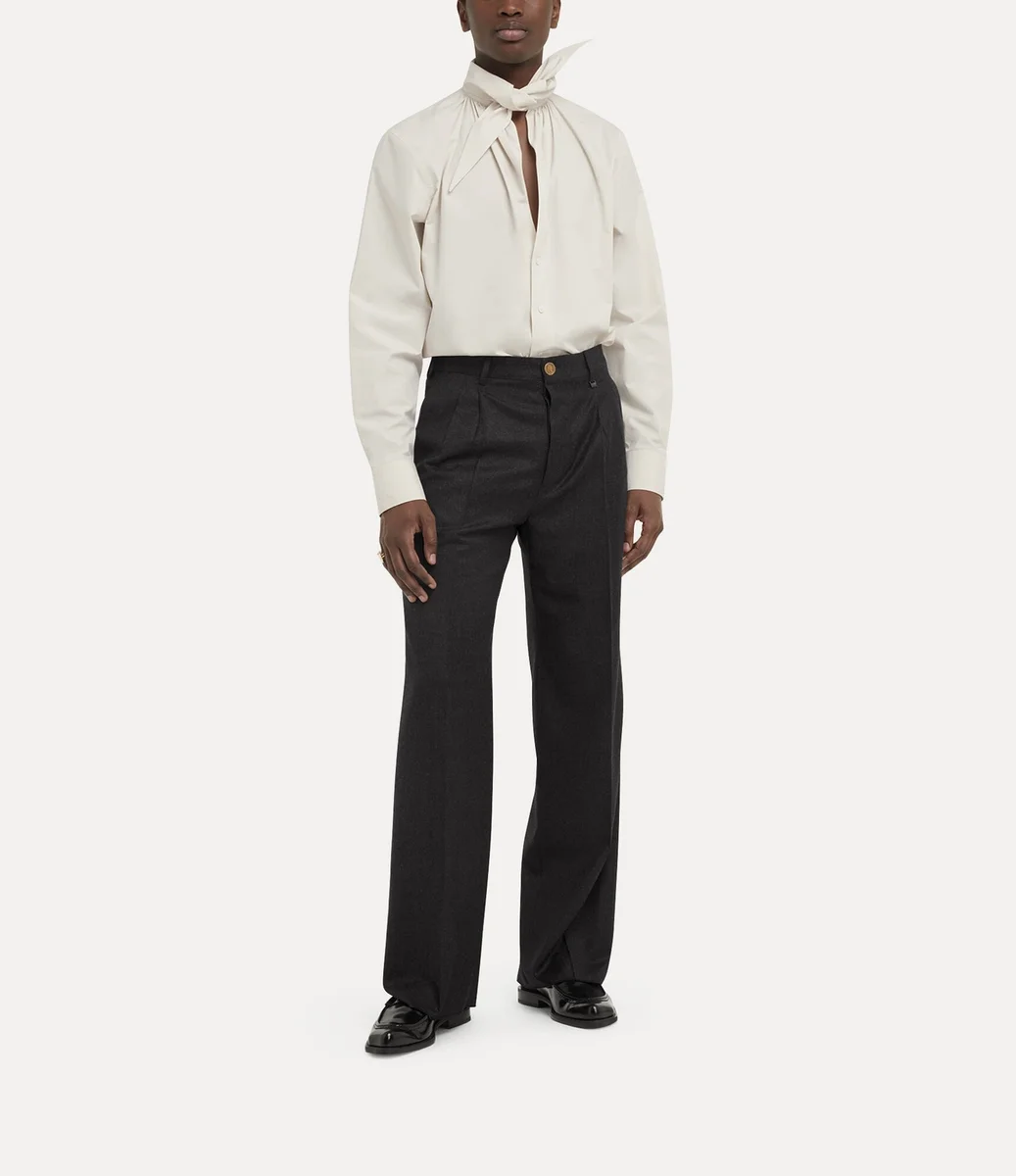 Pantalonii Rafael sunt confecționați din lână moale, țesută delicat, cu finisaj metalic periat. Croiți cu o talie înaltă clasică și încadrați de bucle pentru curea, silueta cade într-un picior larg și fluid, definit de detalii ascuțite cu pliuri presate.