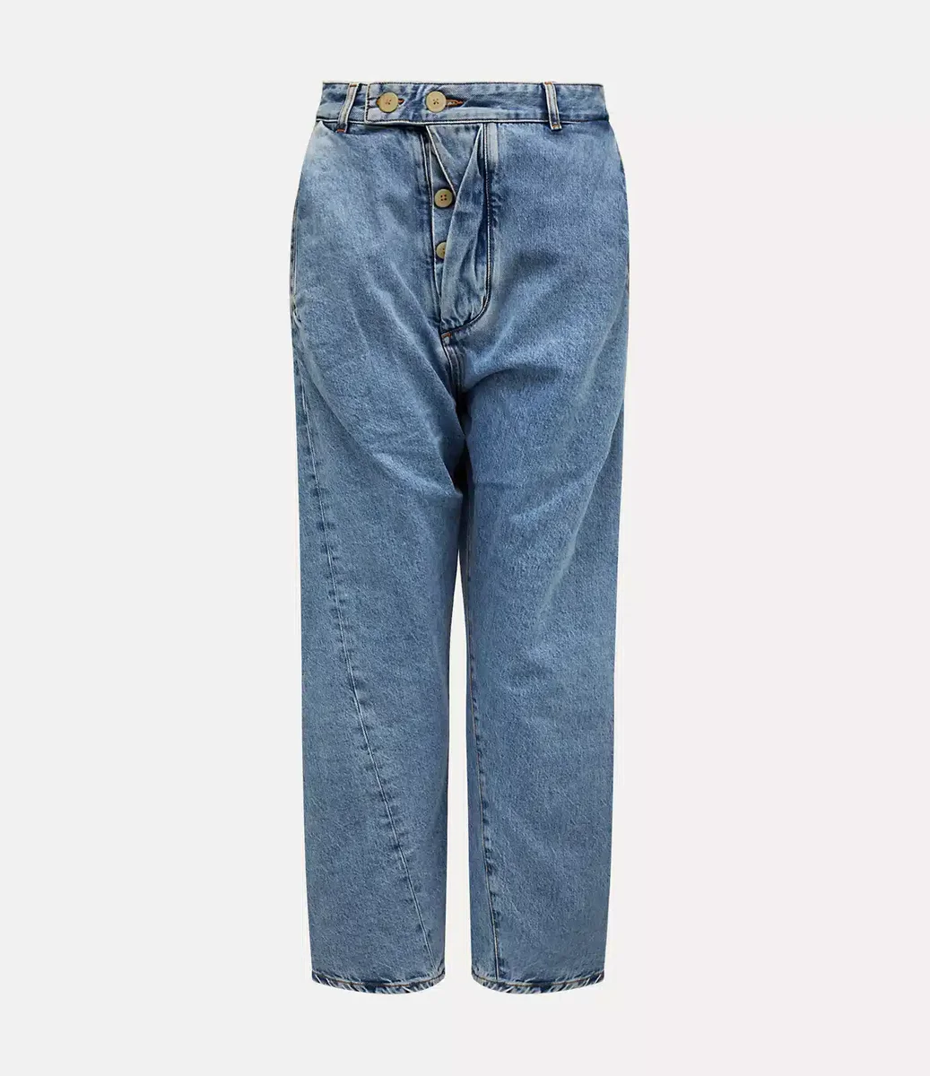 Pantalonii Worlds End Drunken, din denim deschis la culoare, prezintă sistemul „drunken” caracteristic casei, care se inspiră din croiala tradițională britanică, cu o abordare răsucită și asimetrică a tăieturii. Pantalonii se remarcă prin închiderea asimetrică în față, creând un efect distorsionat și drapat care întruchipează estetica punk a casei.p>