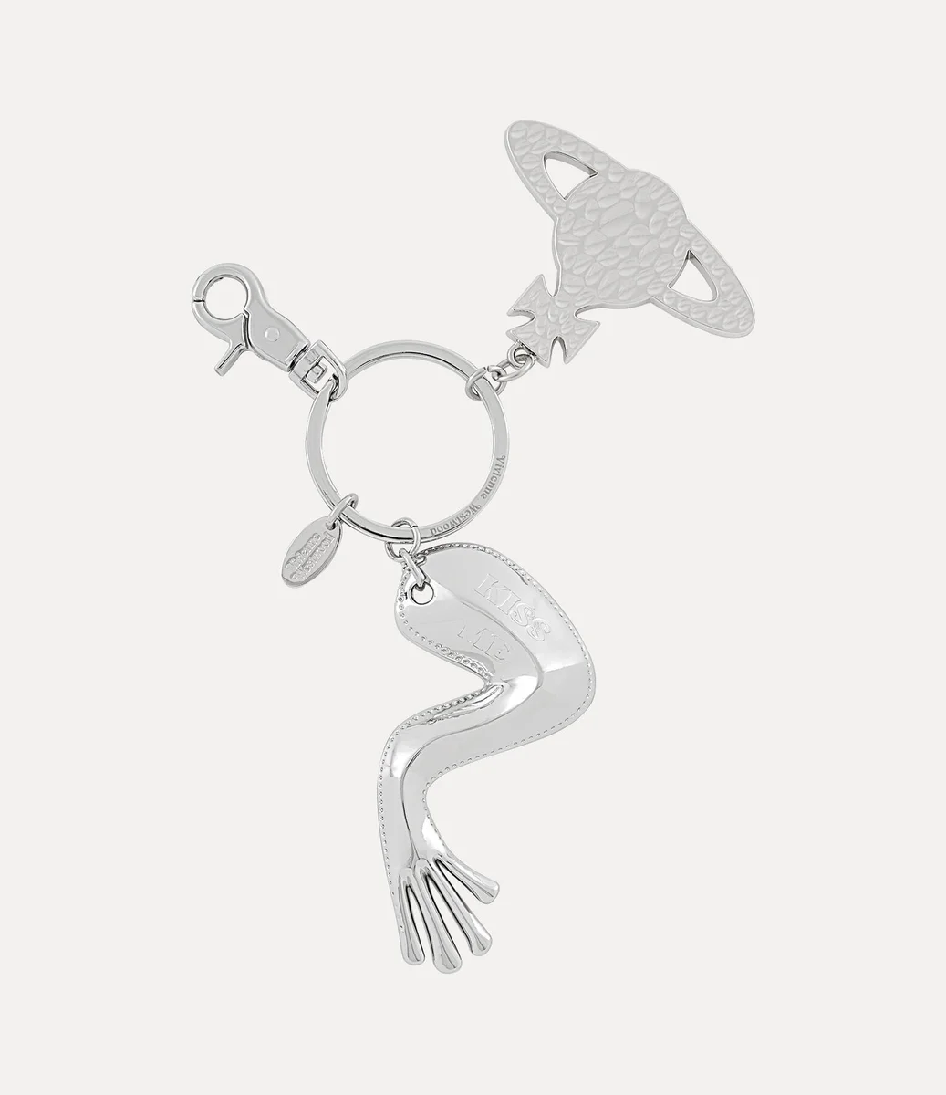 Brelocul nostru Frog Leg Charm, realizat din placaj argintiu lustruit, face referire în mod jucăuș la tradiția basmului „Sărutul broaștei”. Inspirat de decorul antic repoussé, silueta ornamentată a piciorului este gravată cu sloganul „Kiss me” și finisată cu motivul orb cu efect „ciocănit”, semnătura casei.
