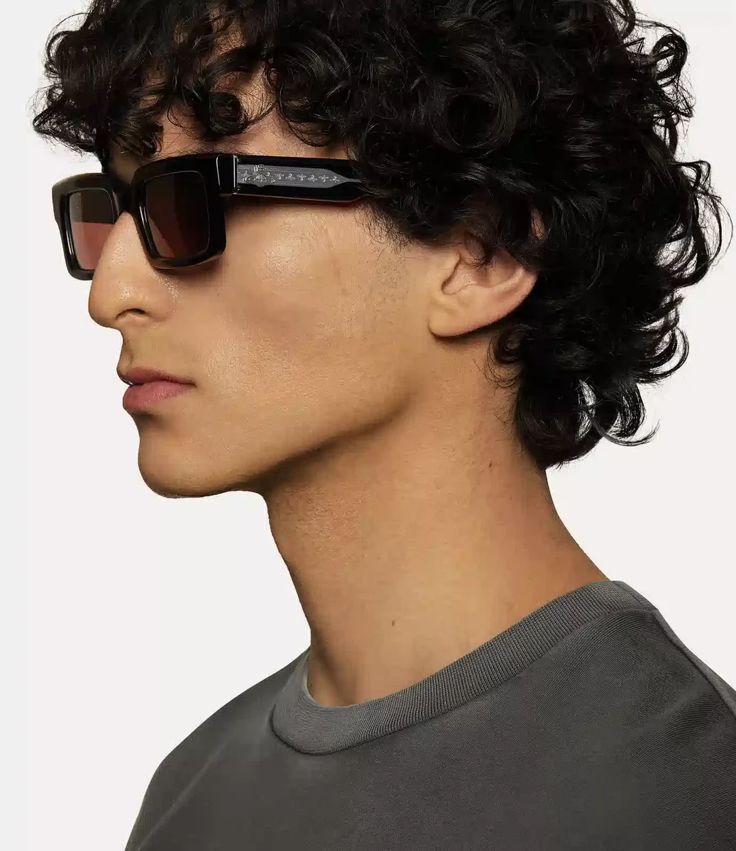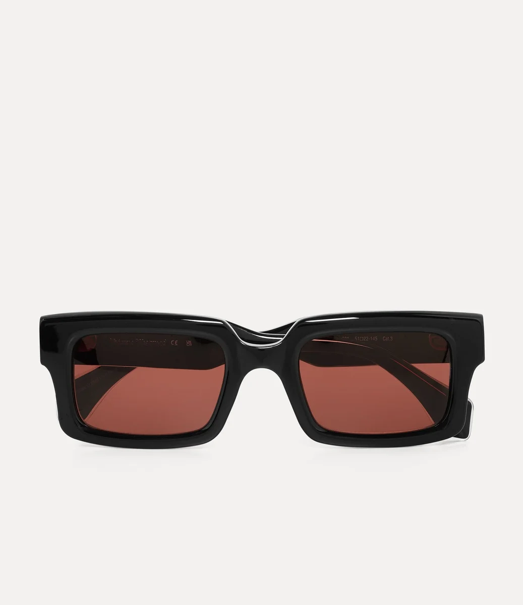 Silueta ochelarilor de soare Costello, de culoare neagră lucioasă, se inspiră din figuri culturale iconice ale scenei și ecranului. Cu rame pătrate groase și lentile maronii, designul distinctiv este pus în valoare de accente complexe din corn care împodobesc marginea exterioară, amintind de banda iconică Horn Alice a lui Vivienne. Brațele sculptate sunt împodobite cu motive sferice la tâmple, iar detaliile metalice personalizate sunt finisate cu gravuri sferice miniaturale.