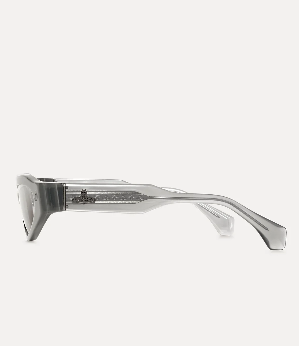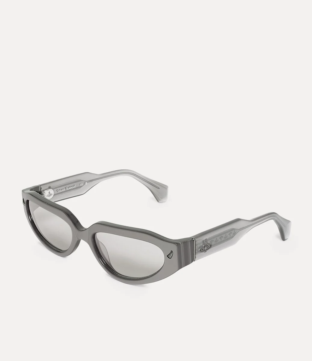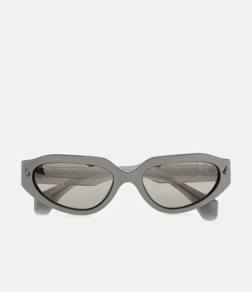 Ochelarii de soare Grace au o siluetă ovală de inspirație vintage, caracterizată de o margine exterioară îndrăzneață, ușor evazată, inspirată de glamourul și iconurile atemporale ale Studio 54. Disponibili într-un finisaj argintiu strălucitor, designul este pus în valoare de lentilele colorate în tonuri similare și de ornamentele în formă de corn care împodobesc marginea exterioară, aducând un omagiu iconicei benzi Horn Alice a lui Vivienne.
