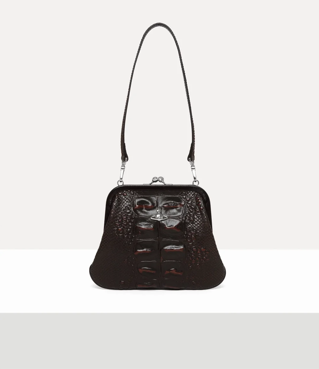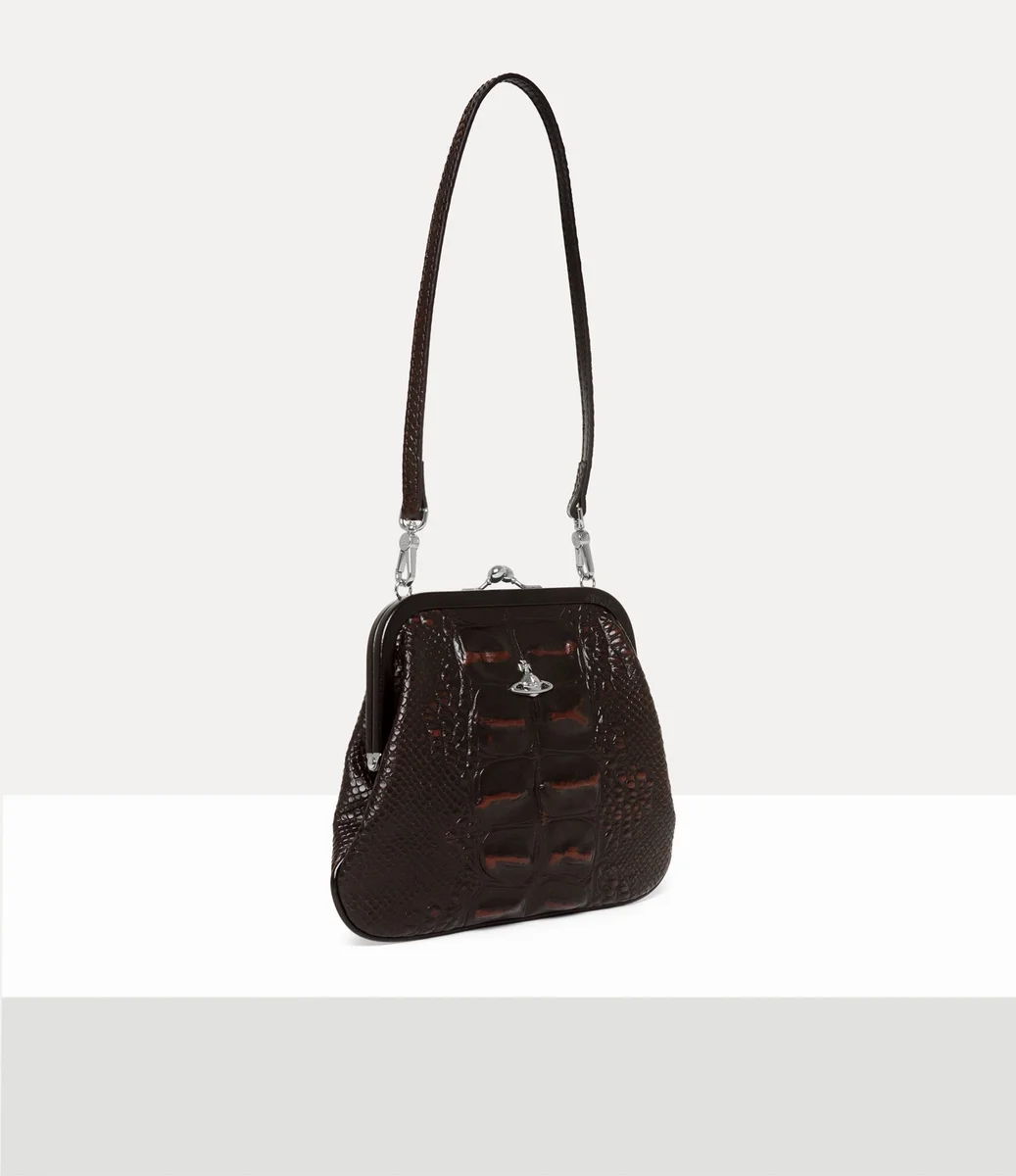 Clutch-ul nostru Vivienne, confecționat din piele, prezintă motivul „Dinosaur” în relief al acestui sezon, care evocă textura pielii reptilelor preistorice. Piesa poartă numele lui Vivienne, care era îndrăgostită de acest stil, și este decorată cu motivul nostru caracteristic „Line Orb” pe panoul frontal.
