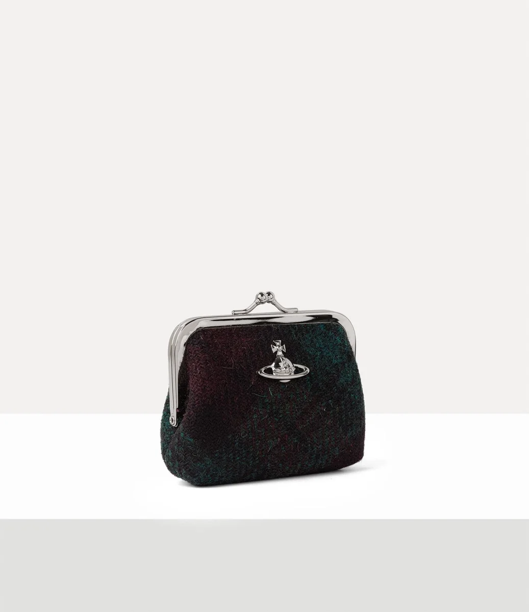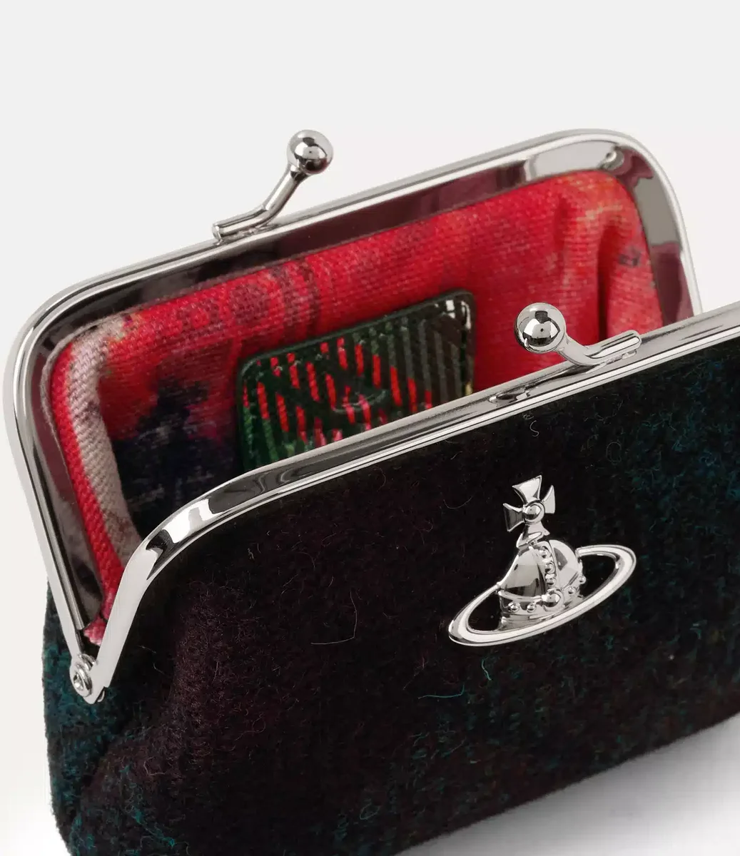 Portofelul nostru cu ramă este decorat cu motivul în carouri Harris Tweed în culori închise, țesut manual de locuitorii insulelor Hebride Externe și Lewis din Scoția. Detaliat cu o ramă expusă în nuanțe aurii și finisat cu un fermoar delicat, designul amintește de portofelele vintage de la începutul secolului XX.