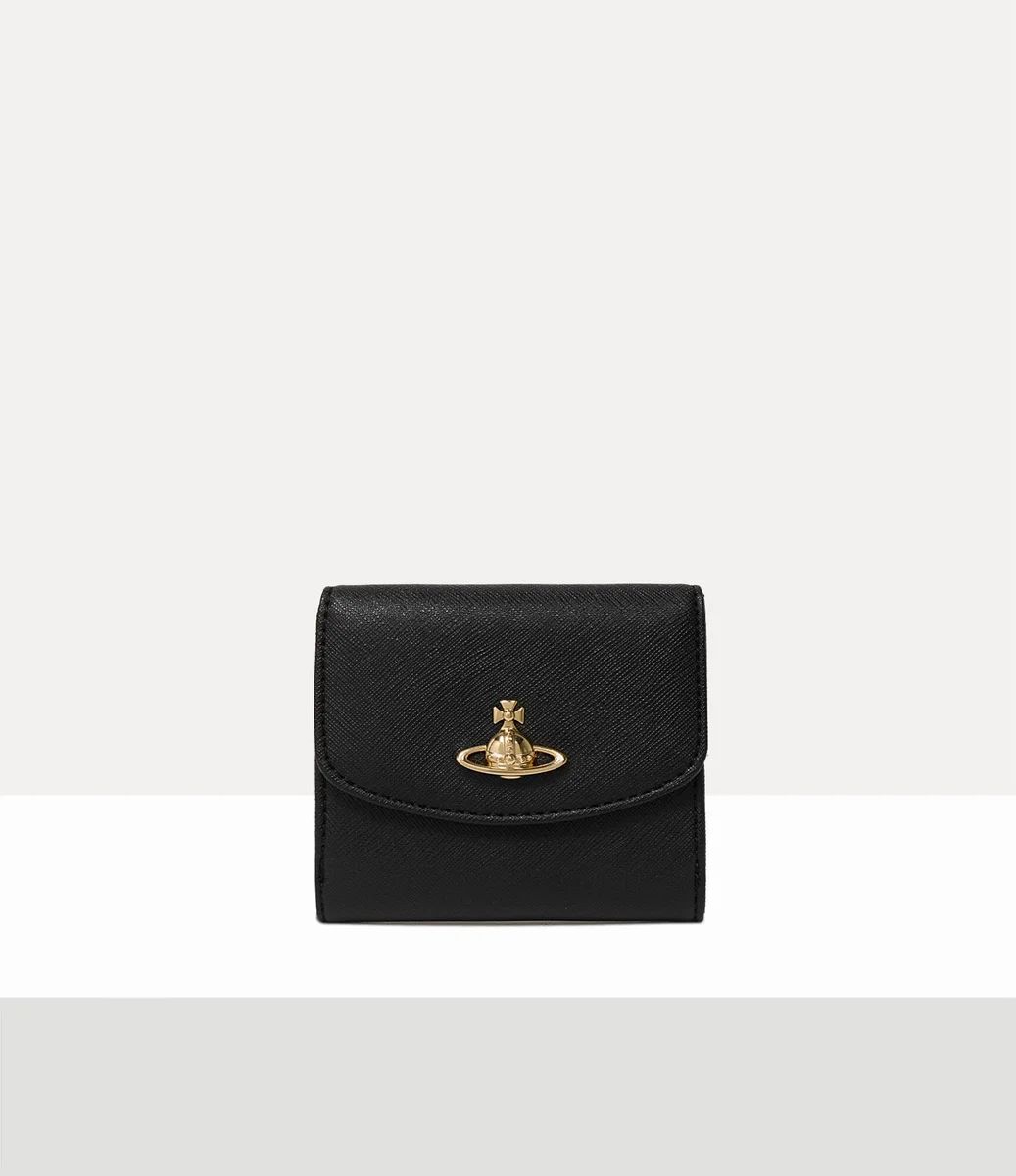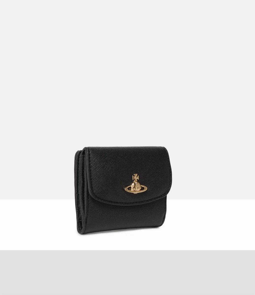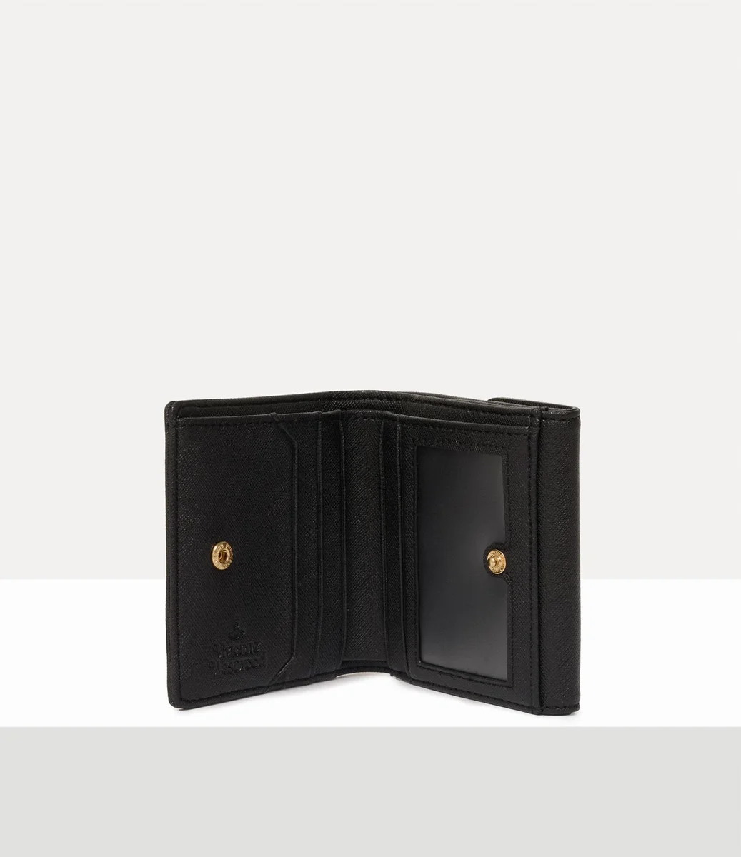 Portofelul nostru mic are un design elegant, pliat în două, confecționat din piele PU și se distinge prin textura sa saffiano în cruciulițe. Logo-ul iconic al casei, în metal auriu, împodobește clapeta frontală, așezat deasupra unui sistem de închidere cu capse lustruite, în timp ce marca subtilă în relief îmbogățește panoul interior.