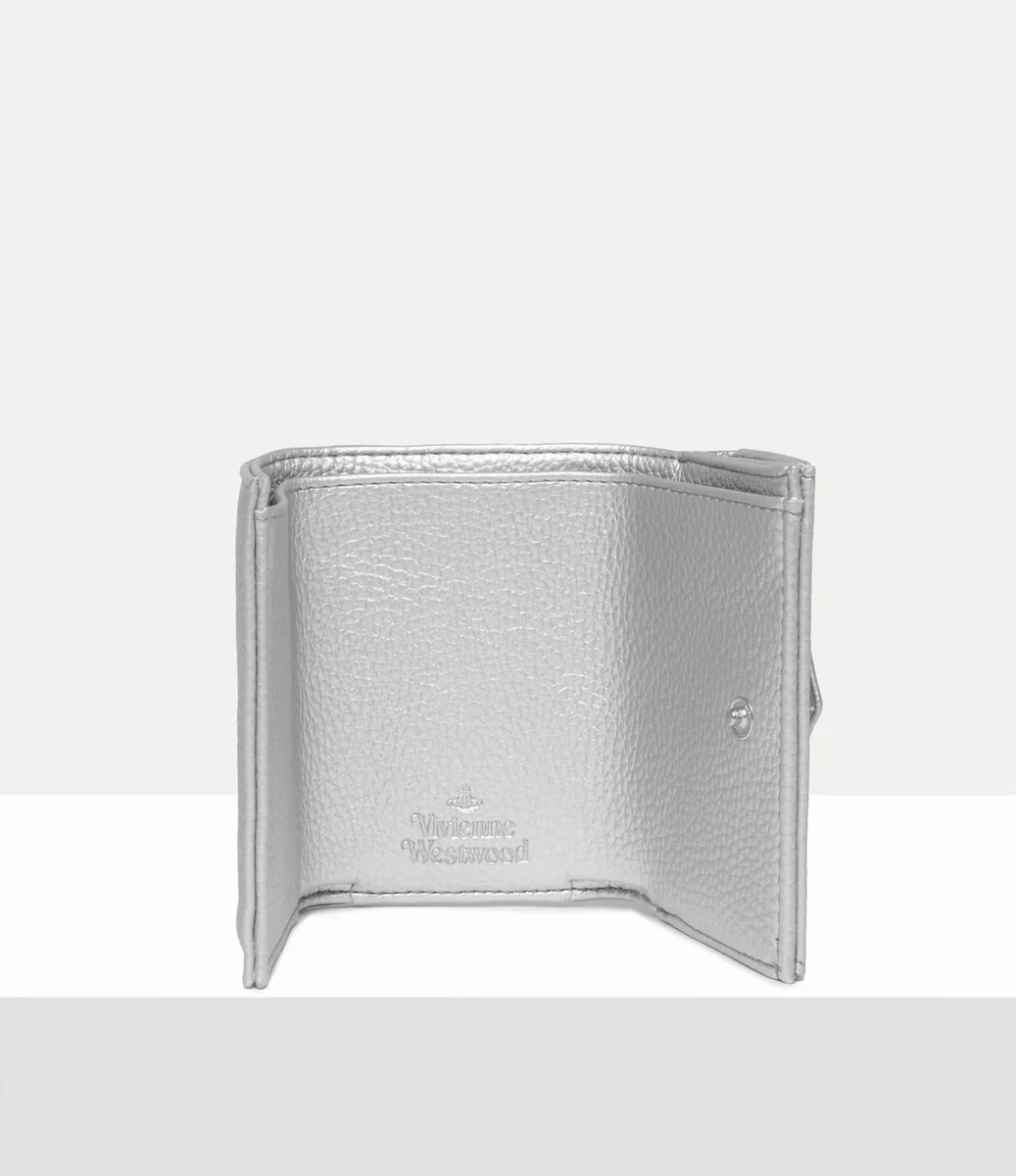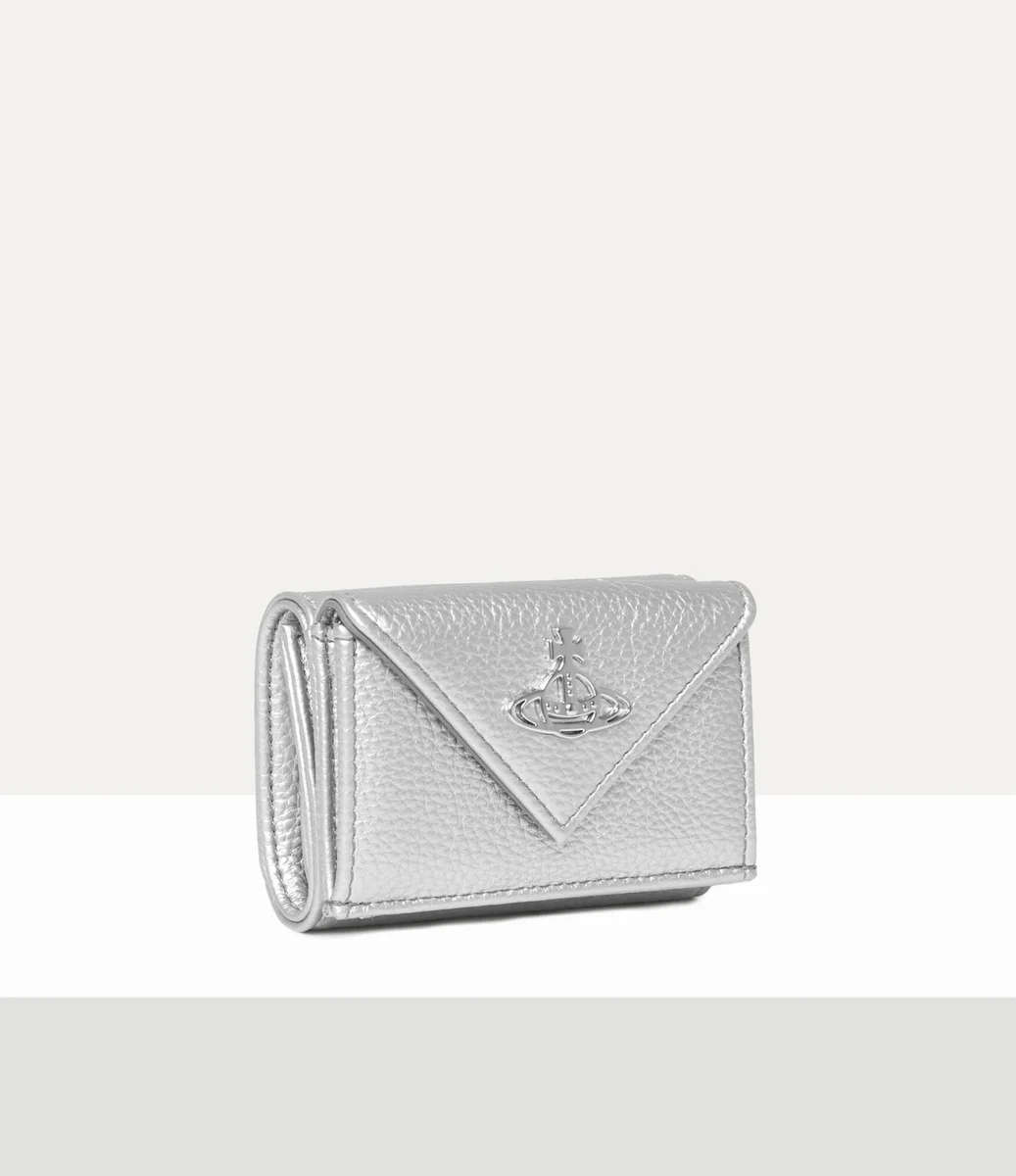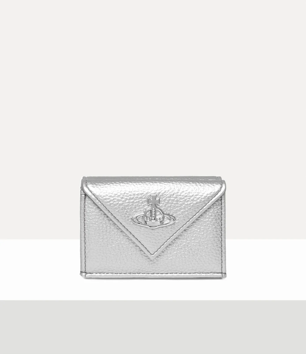 Portofelul nostru Envelope are o siluetă din PU argintiu, embosată cu finisajul cu efect granulat al acestui sezon. Designul prezintă motivul metalic „Line Orb”, semnătura casei, pe închizătoarea cu capse, întruchipând viziunea Viviennei de a propulsa tradiția în viitor.