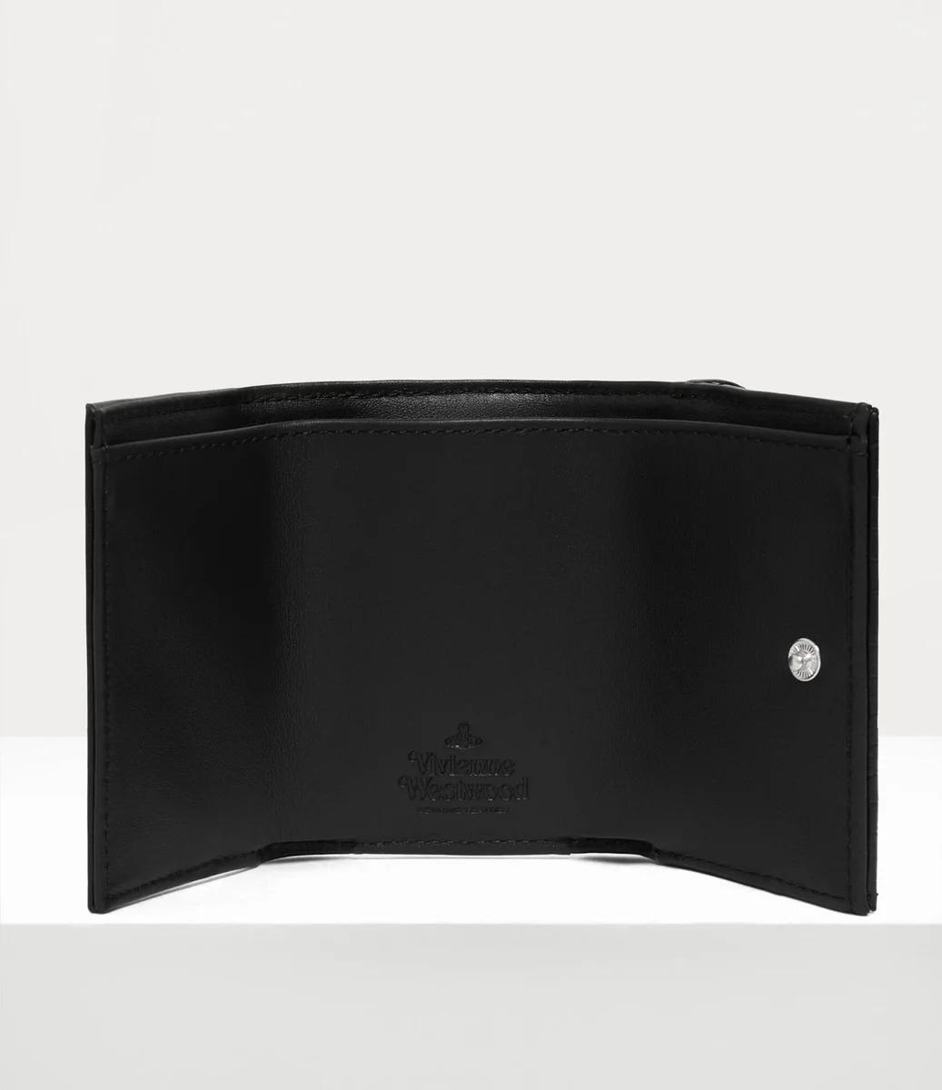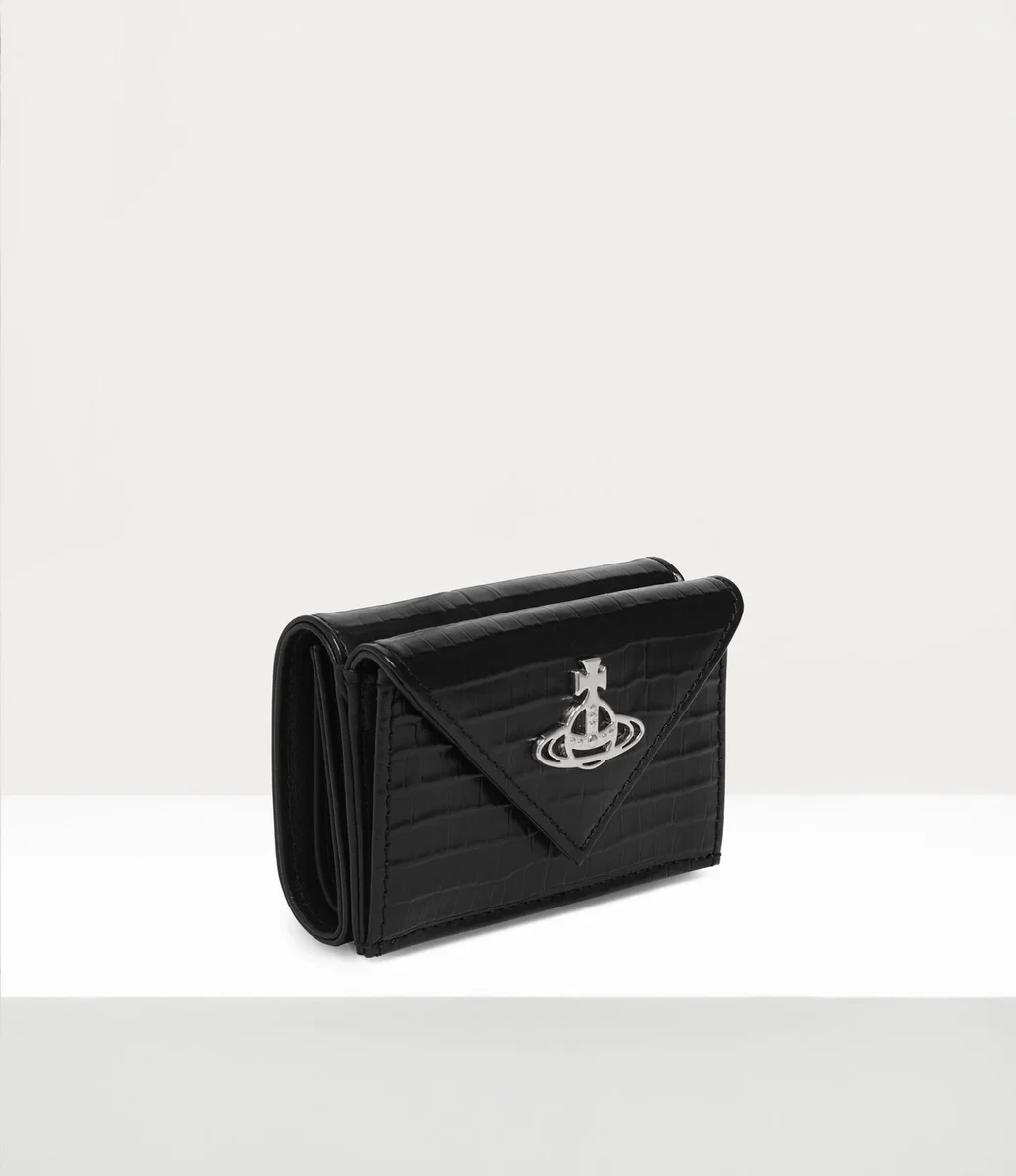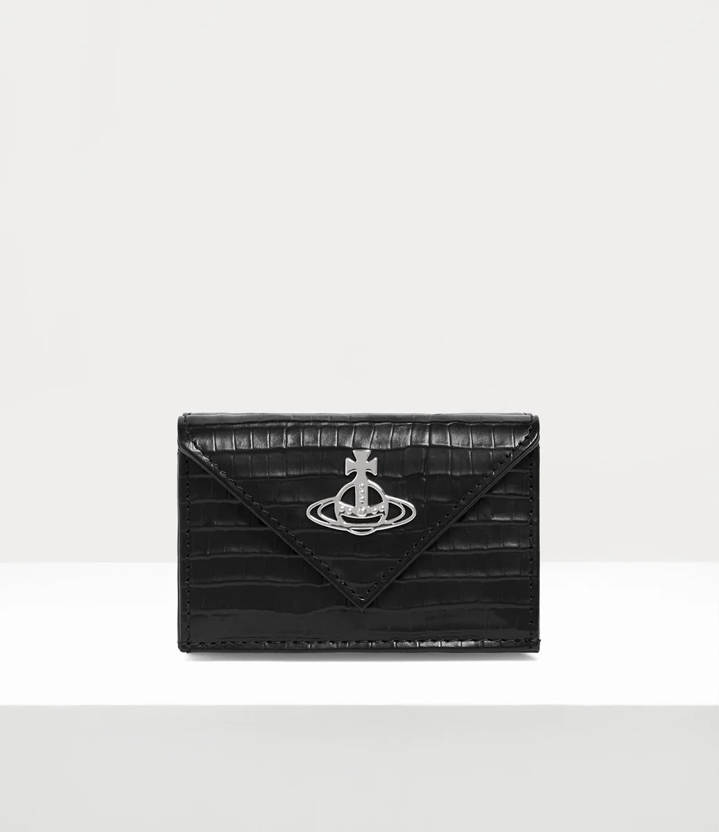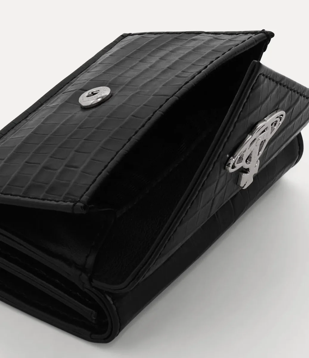 Portofelul nostru Envelope este reimaginat în piele mini cu efect croc embosată, specifică sezonului. Finisat cu motivul metalic „Line orb”, semnătura casei, pe închizătoarea cu capse, acest articol întruchipează viziunea Viviennei de a propulsa tradiția în viitor.