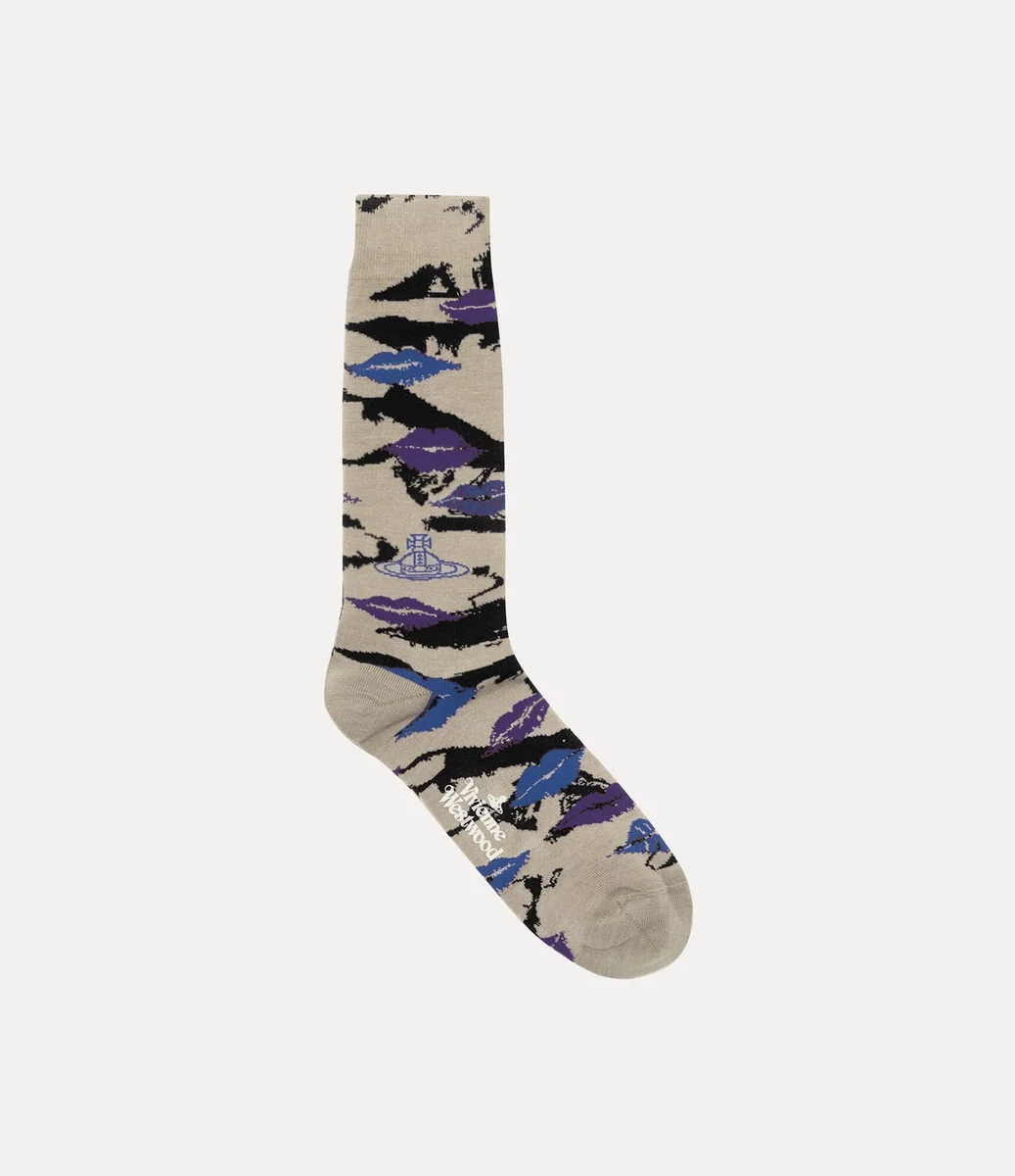 Șosetele noastre au o bază tricotată jacquard, acoperită cu desenul „Kisses” (Săruturi) – apărut pentru prima dată pe ambalajul parfumului Boudoir al casei – pentru a crea un model abstract de camuflaj. Confecționate dintr-un amestec moale de bumbac, acestea prezintă motivul caracteristic orb pe laterale.