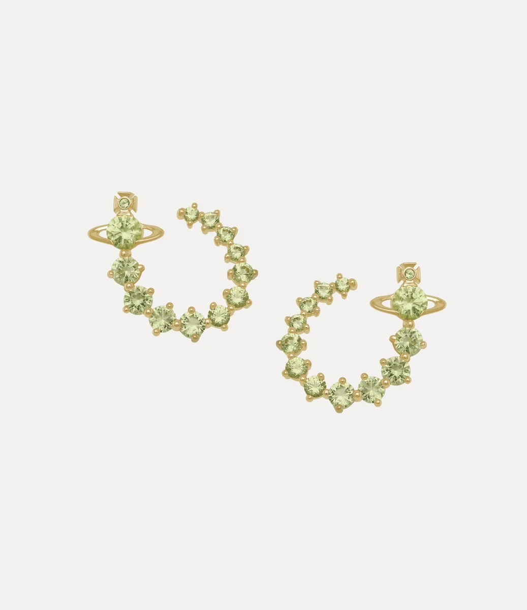 Realizați din placaj auriu lustruit, cerceii noștri Lydia se curbează ușor în jurul lobului urechii pentru a crea iluzia unui cerc sculptural. Împodobiți cu pietre de zirconiu cubic care se îngustează elegant în dimensiune, designul este decorat cu emblema noastră atemporală în formă de glob – amintind de viziunea Viviennei de a duce tradiția în viitor.