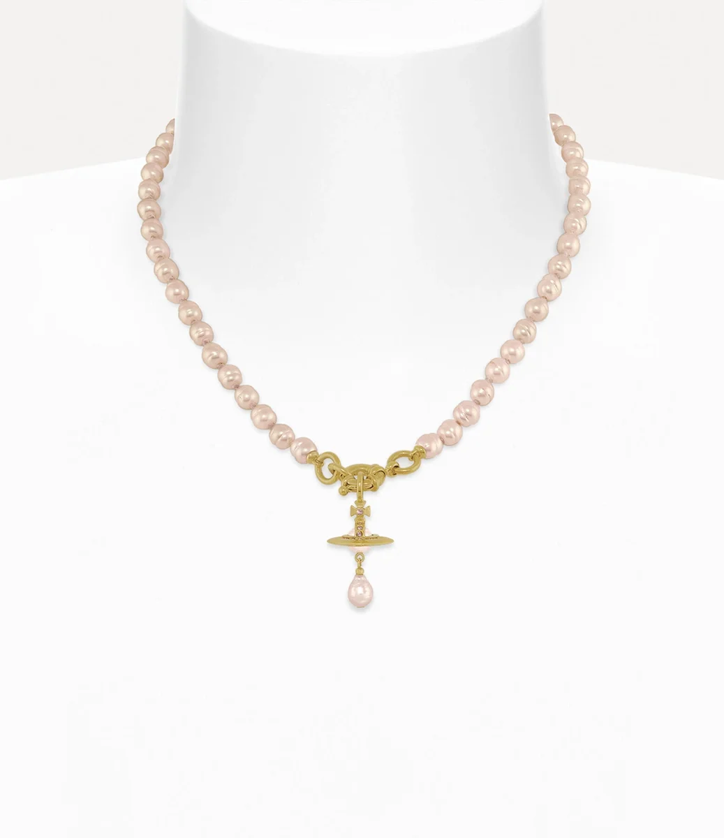 Colierul Vivienne Westwood Aleksa are un șir de perle de sticlă și un motiv tridimensional în formă de glob, completat de un placaj lustruit, în nuanțe aurii.
