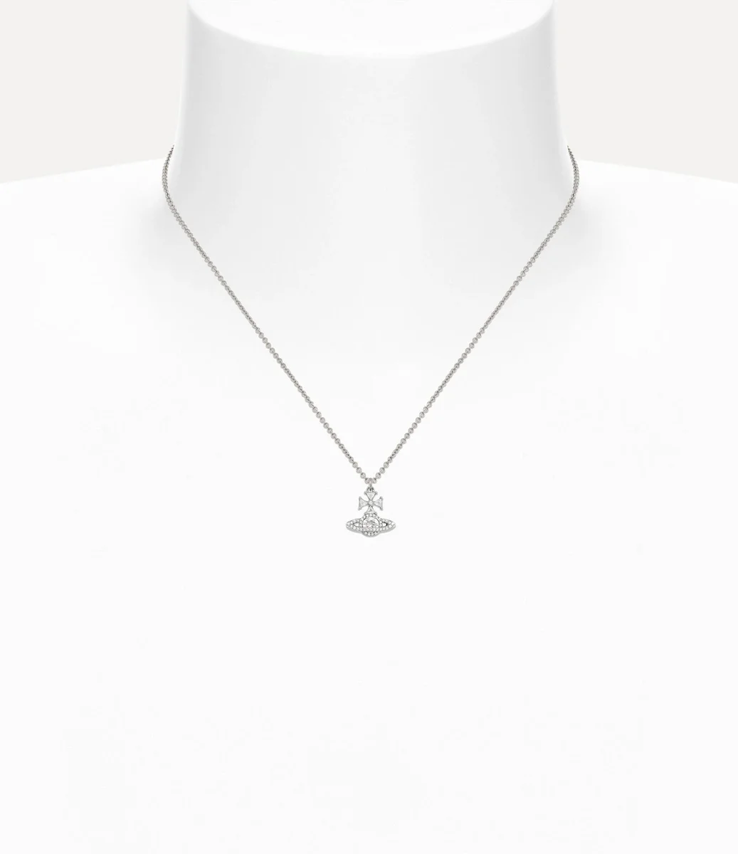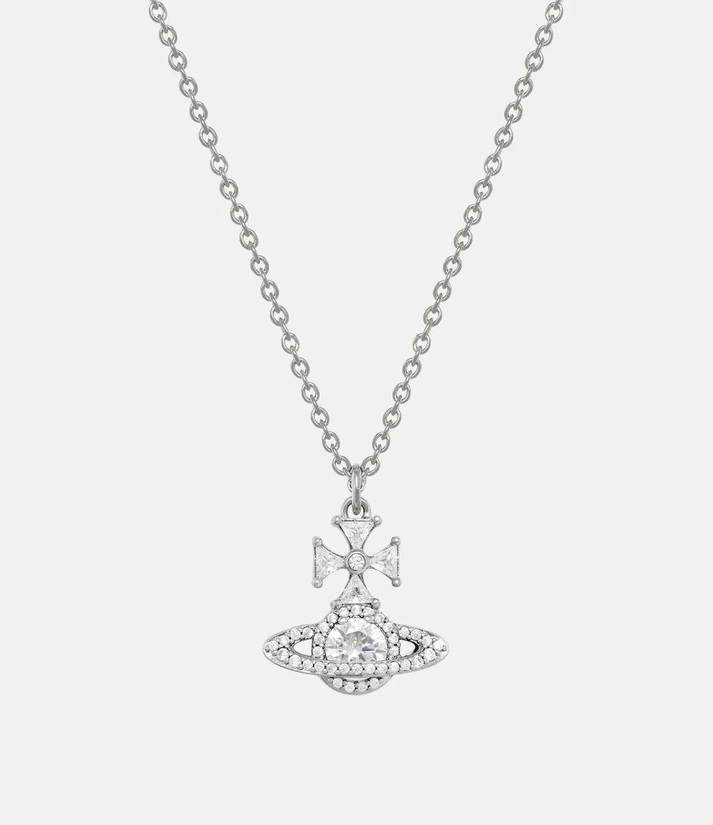Realizat din placaj argintiu lustruit, colierul Mila reînvie motivul orb caracteristic casei, centrat cu un cristal alb strălucitor tăiat rotund și încadrat de un halou de pietre tonale pavate. Partea superioară în formă de cruce este finisată cu pietre prețioase triunghiulare fațetate în monturi delicate, suspendate de un lanț delicat.