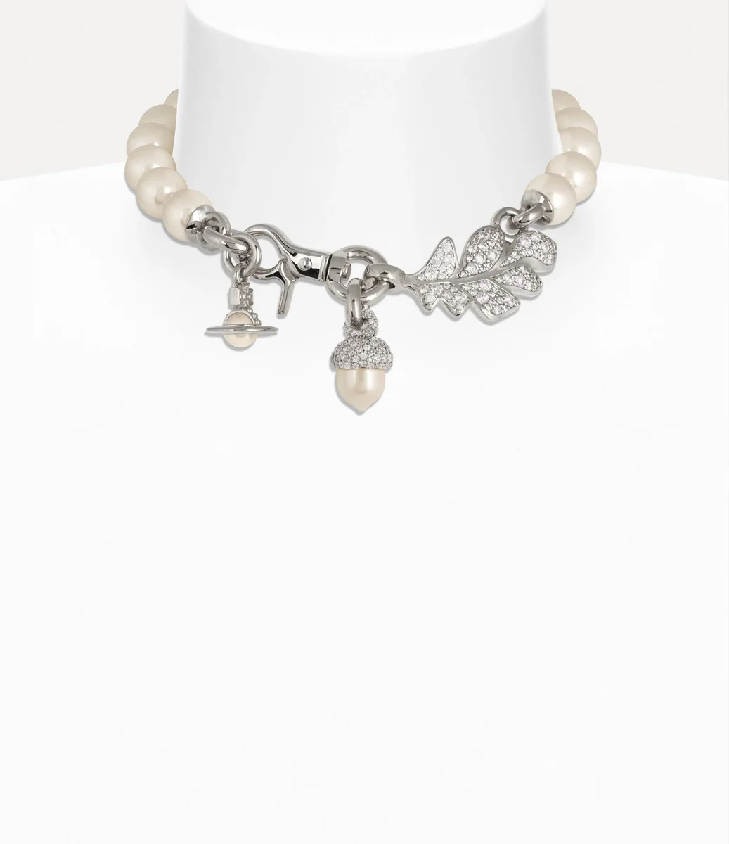 Colierul Lucille Large are un șir de perle Swarovski supradimensionate, pe bază de sticlă, împodobite cu motivele iconice ale casei, ghinda și frunza. Îmbogățită cu ornamente pavate, piesa este finisată cu un fermoar pivotant, de care atârnă elegant o bilă.