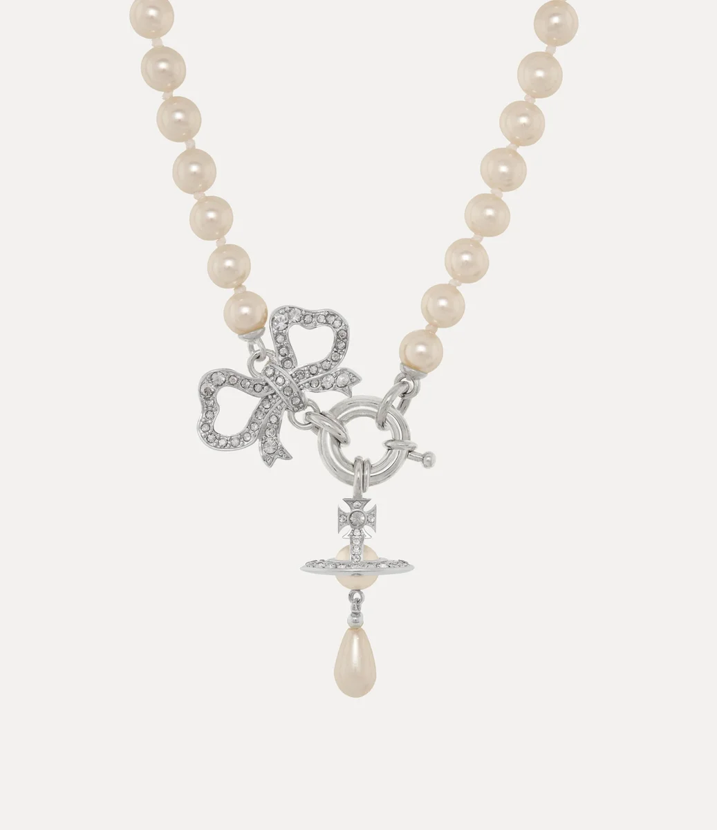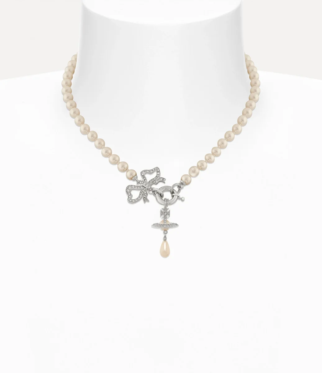 Colierul Rigoberta Pearl, cel mai recent model din gama Rigoberta, are un șir de perle de sticlă Swarovski și un pandantiv complex în formă de fundă, inspirat din stilul georgian – un element iconic al casei. În centrul său, motivul sferic tridimensional este evidențiat de un detaliu în formă de lacrimă, finisat cu un sistem de închidere cu arc.