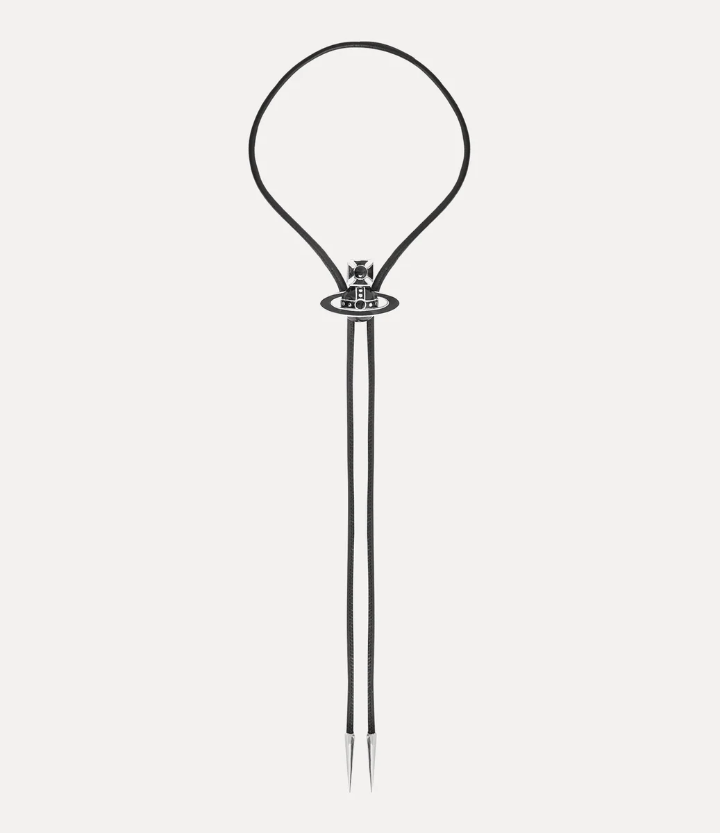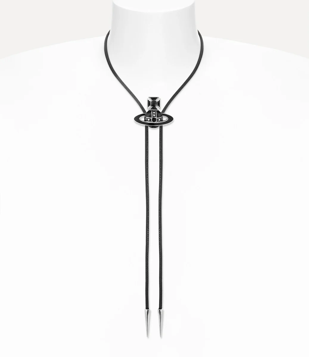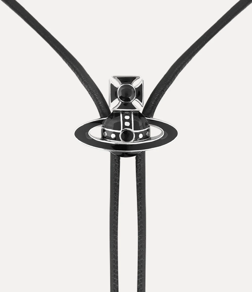 În acest sezon, cravata Bolo îndrăzneață este reinterpretată cu un finisaj emailat, inspirat de motivul în formă de glob caracteristic casei. Realizată dintr-un cordon din piele cusut, are o piesă centrală ajustabilă în formă de glob și este completată cu vârfuri lustruite în nuanțe argintii.