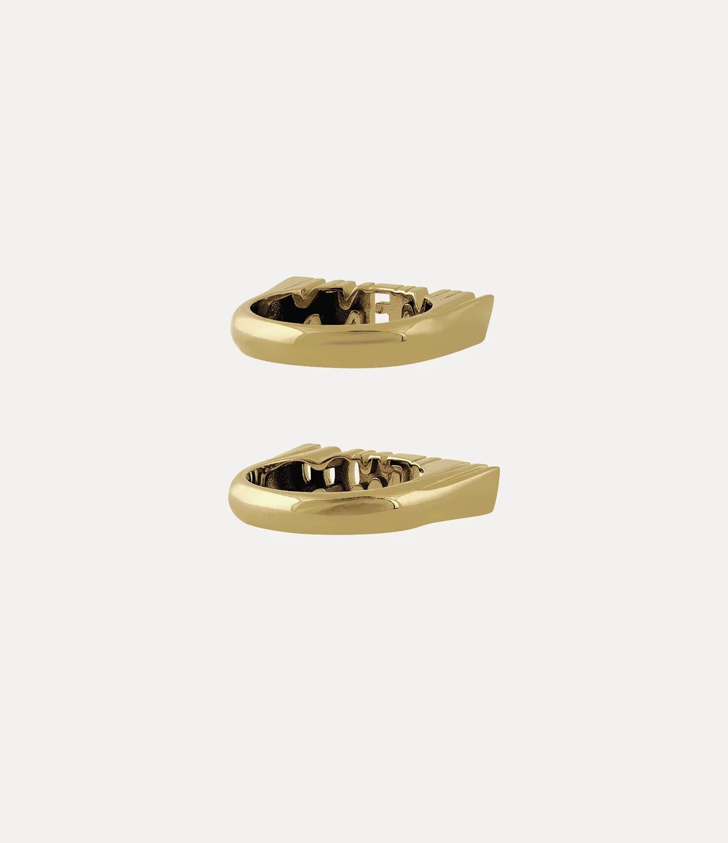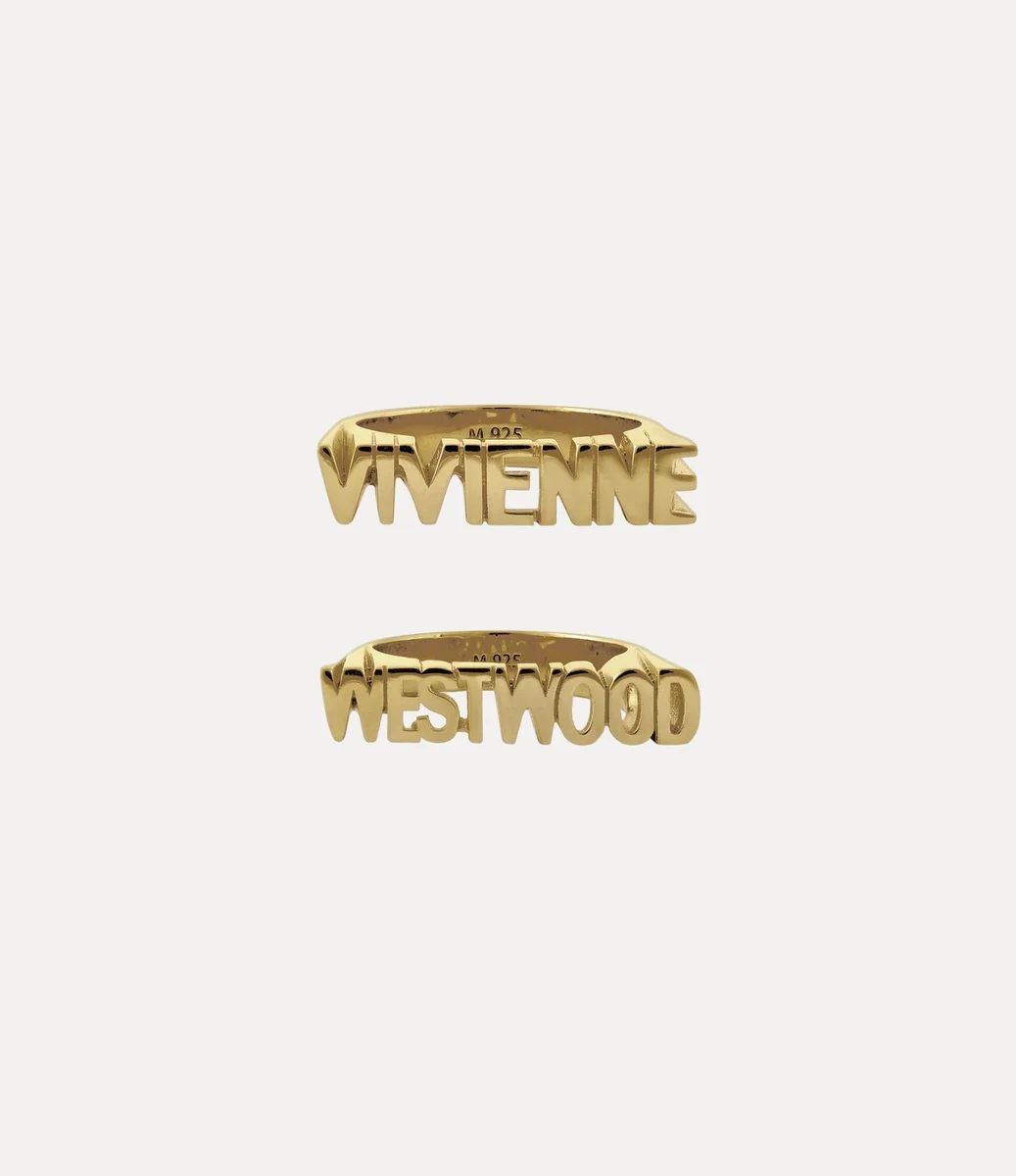 Inelul nostru Essex este realizat din argint reciclat și finisat cu placare aurie lustruită. Prezentând două benzi metalice îndrăznețe, una cu inscripția „Vivienne”, cealaltă cu „Westwood”, designul este accentuat cu detalii complexe decupate care conturează fiecare literă.