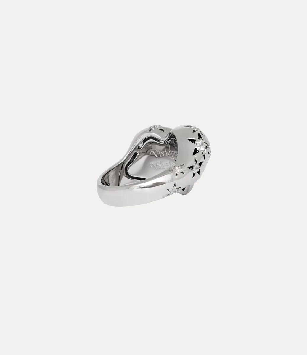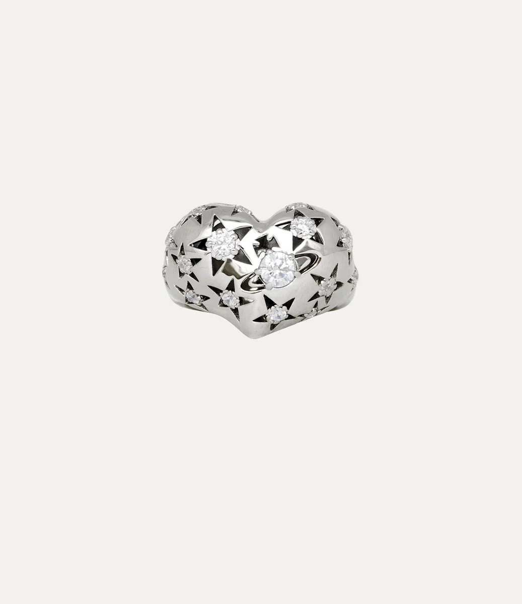 Inelul nostru Lee este sculptat din argint reciclat și finisat cu un strat radiant de platină. Fața are forma unei inimi asimetrice, un semn al afecțiunii lui Vivienne pentru umanitate și planetă, completată cu stele și motive orb încrustate cu cristale împrăștiate pe suprafața sa.