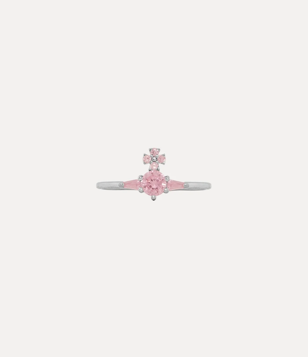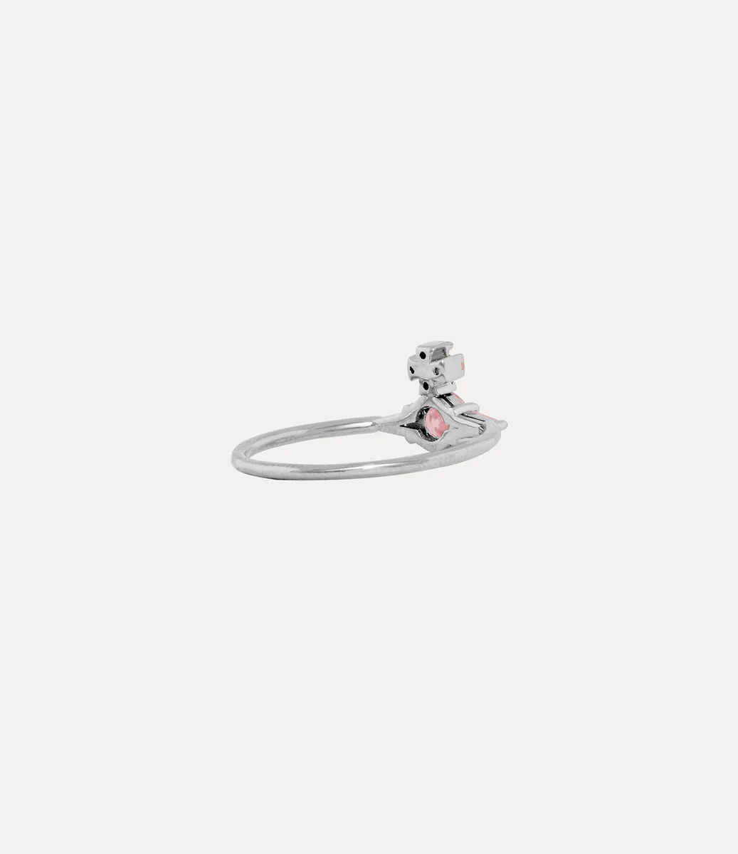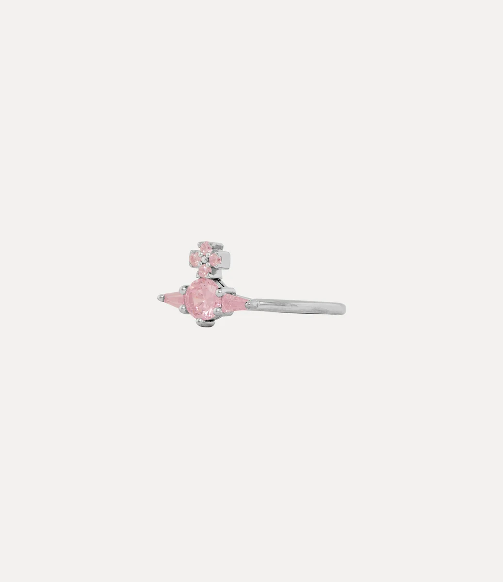 Inelul nostru Ofelia este realizat din argint în nuanță platină și are în centru un motiv delicat în formă de glob, inspirat de emblema casei. Designul este încrustat cu un cristal roz tăiat rotund, încadrat de cristale baguette conice și detalii pavé în partea superioară a crucii, întruchipând viziunea Viviennei de a lansa tradiția în viitor.