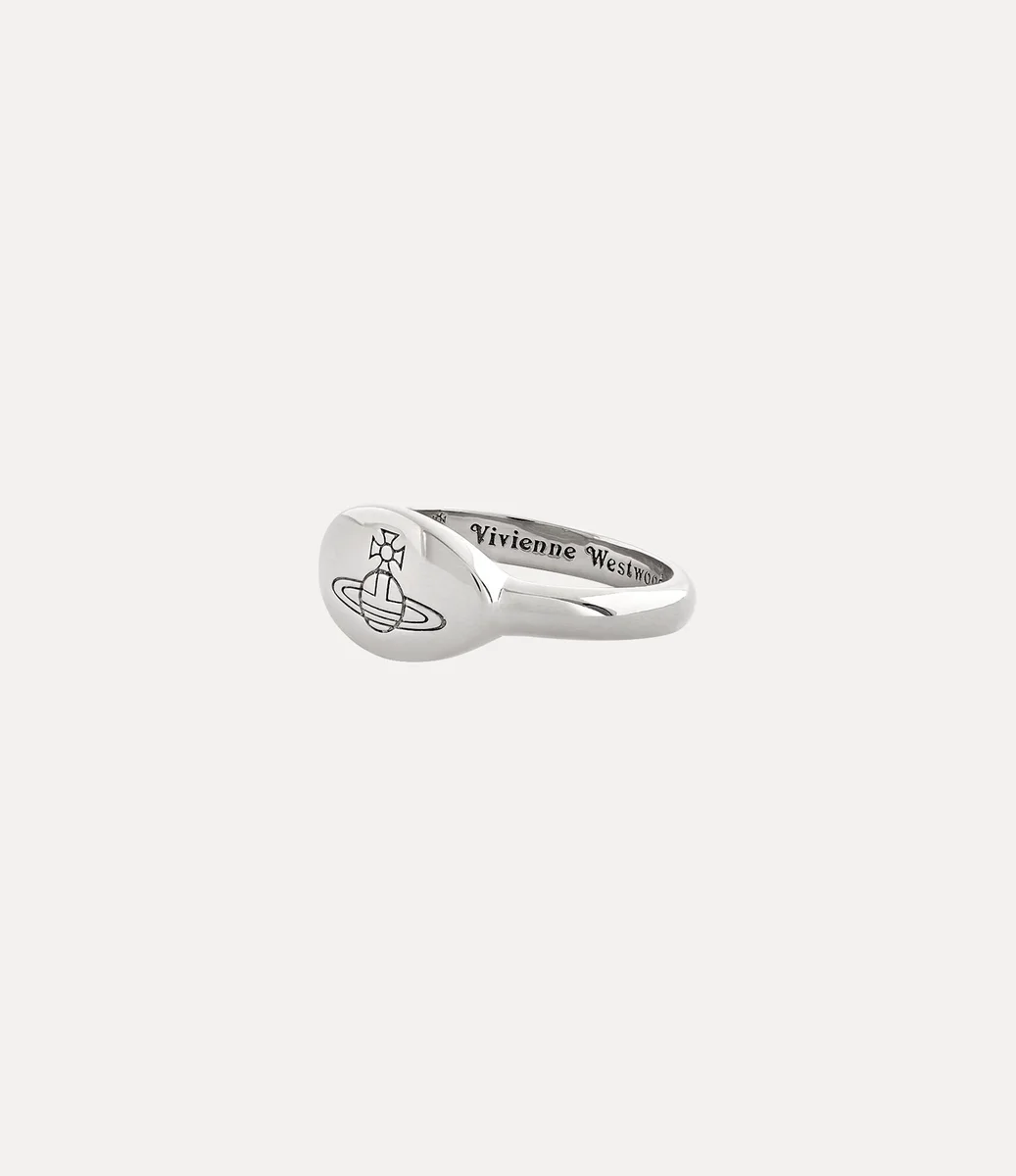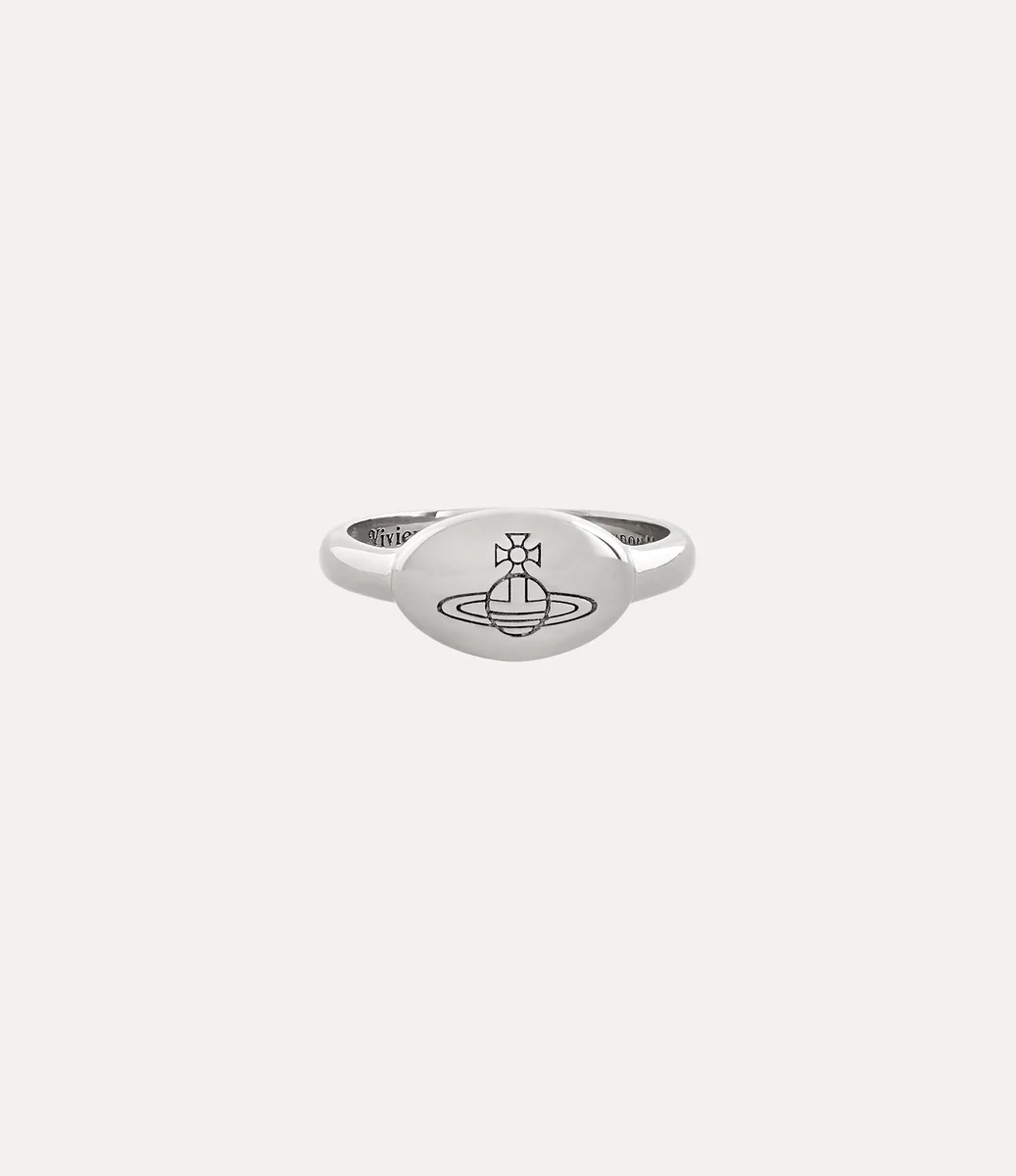 Inelul nostru Tilly are o siluetă clasică de sigiliu, completată de un finisaj din argint reciclat, îmbunătățit de placarea în tonuri de platină. Această piesă este împodobită cu o față ovală, cu o gravură a globului nostru semnătură, îmbogățită cu patină pentru a ridica designul general – amintind de viziunea Viviennei de a lansa tradiția în viitor.