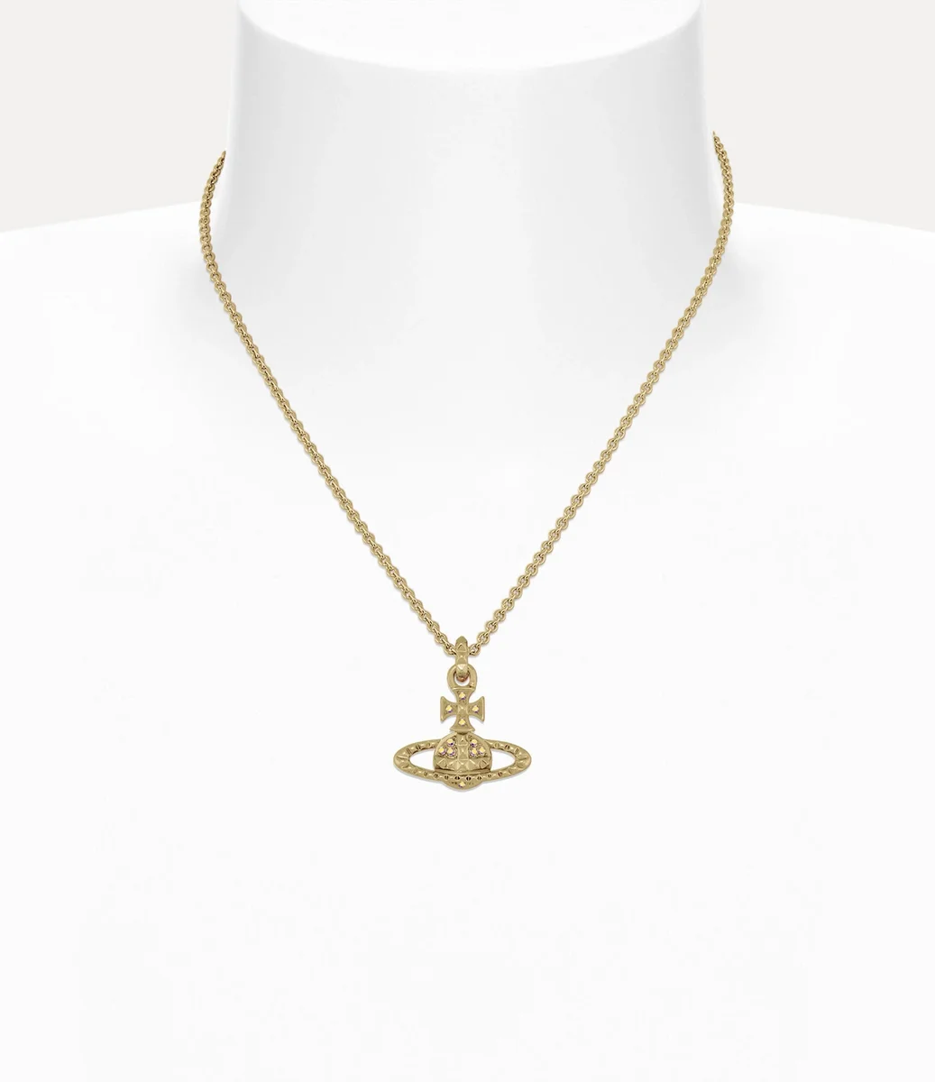 Colierul Mayfair Bas Relief revine în acest sezon cu placare aurie și ornamente strălucitoare din cristal irizat. Piesa are o siluetă în formă de glob, sinonimă cu viziunea casei de a lansa tradiția în viitor, completată cu detalii cu știfturi, simboluri ale nonconformismului – în conformitate cu abordarea punk caracteristică a lui Vivienne.