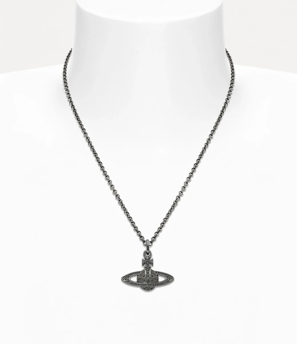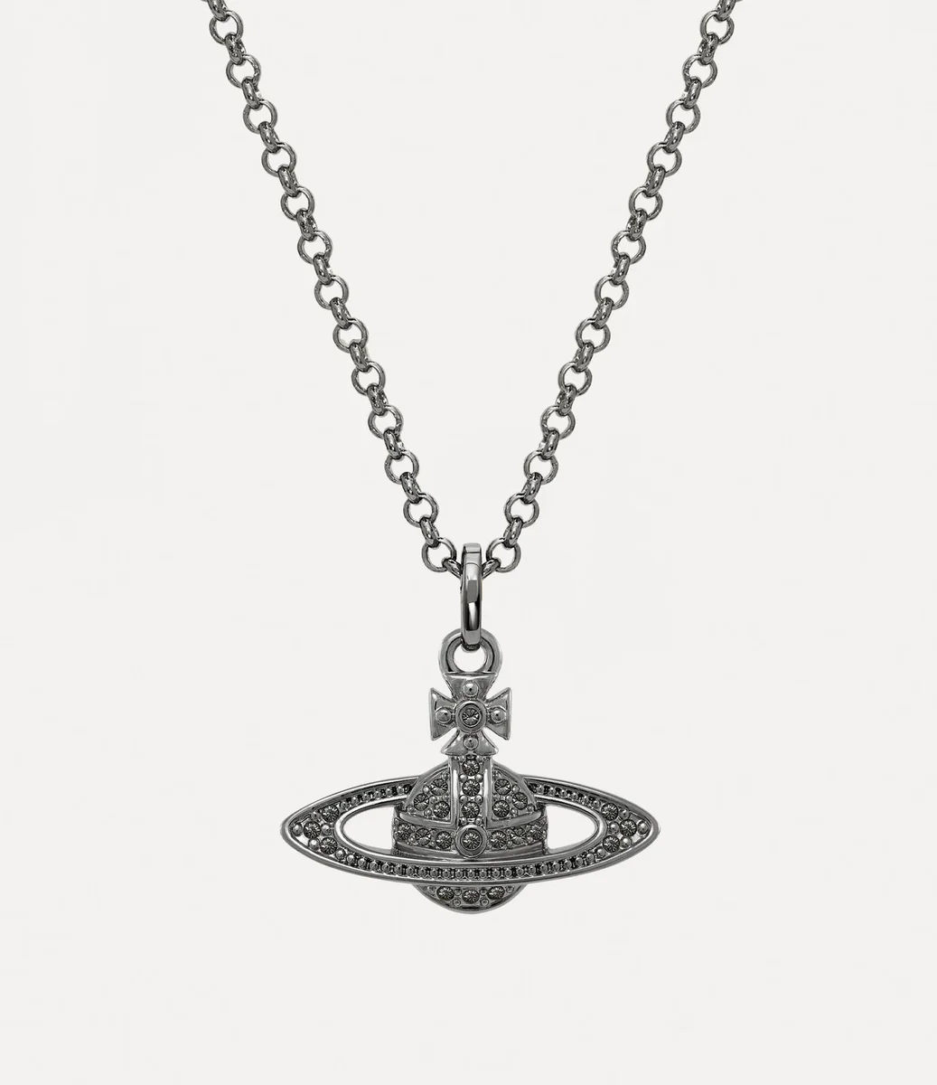 Globul este un element esențial al iconografiei casei, evocând viziunea Viviennei de a lansa tradiția în viitor. Colierul nostru Mini Bas Relief Pendant are un glob incrustat cu cristale în centrul designului, completat cu o etichetă gravată la închizătoarea clasică tip homar.