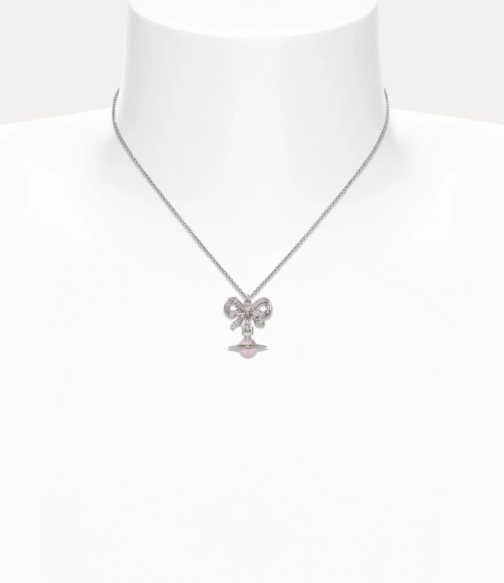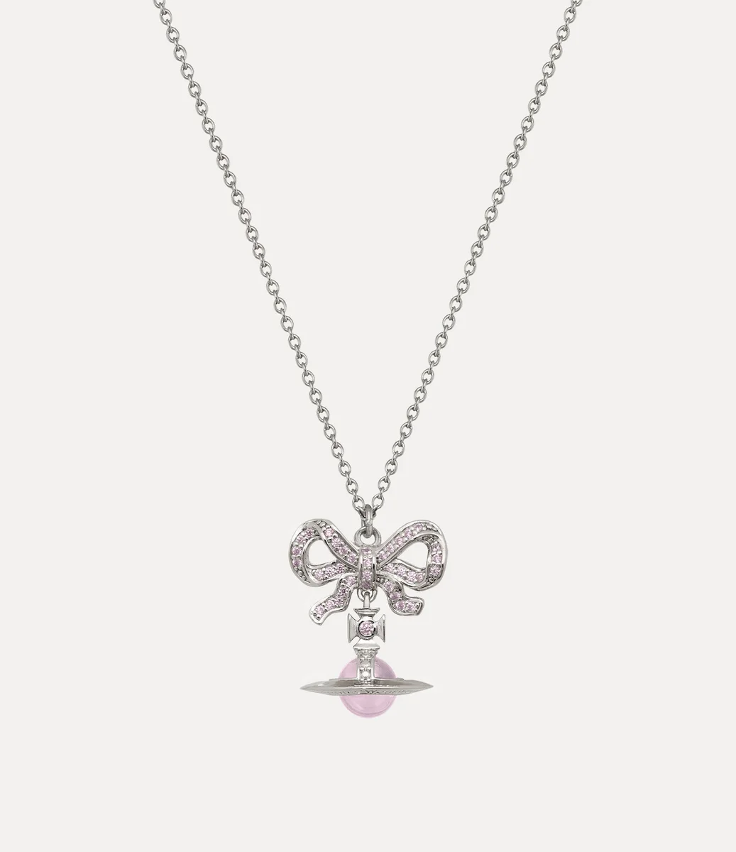 Colierul nostru Octavie este realizat din argint reciclat și finisat cu placare lustruită în tonuri de platină. Îmbogățit cu cristale albe strălucitoare, designul combină o fundă în stil georgian cu sfera tridimensională caracteristică în centru, realizată într-un finisaj roz pal, care reflectă motivul clasic al casei.