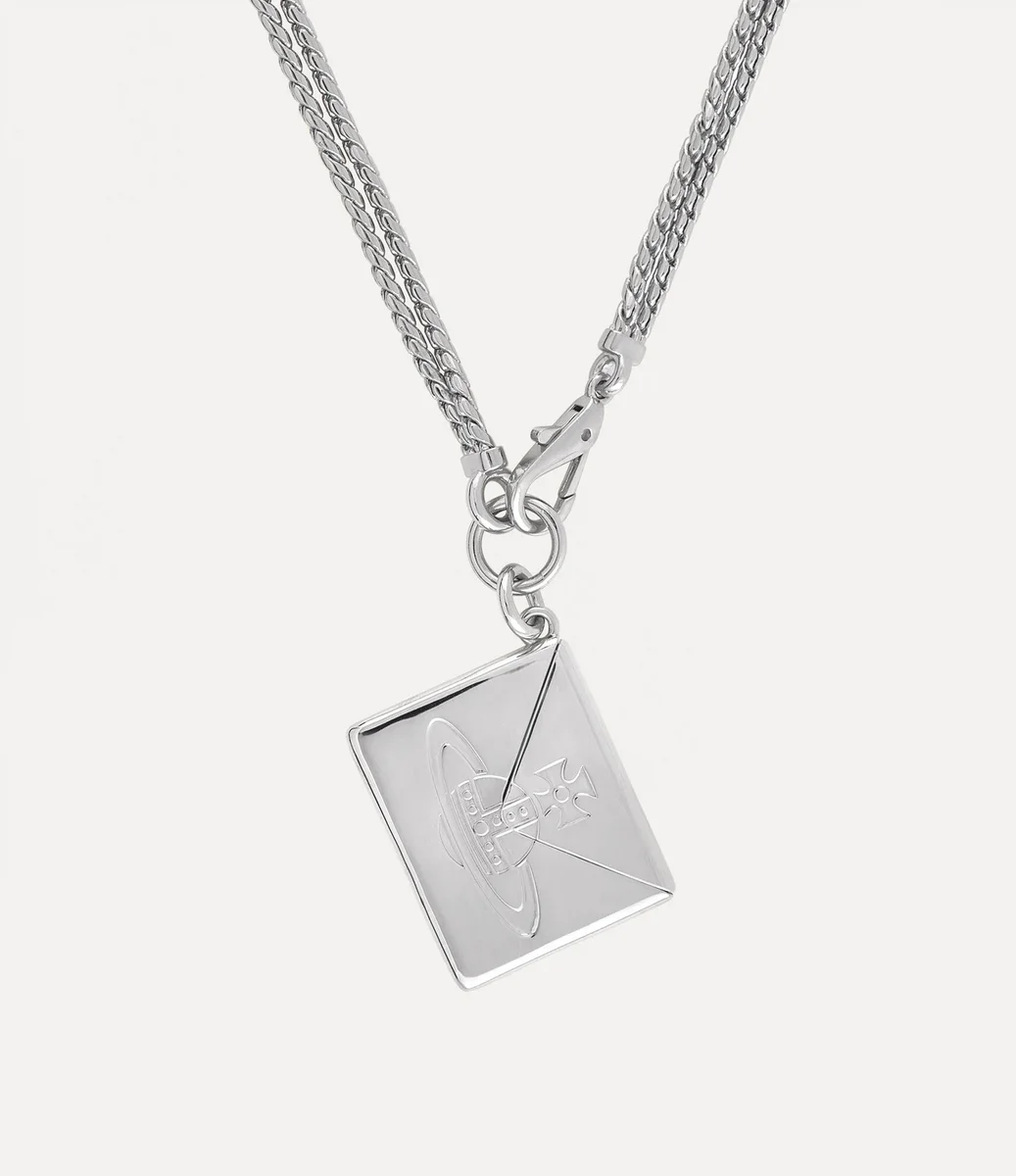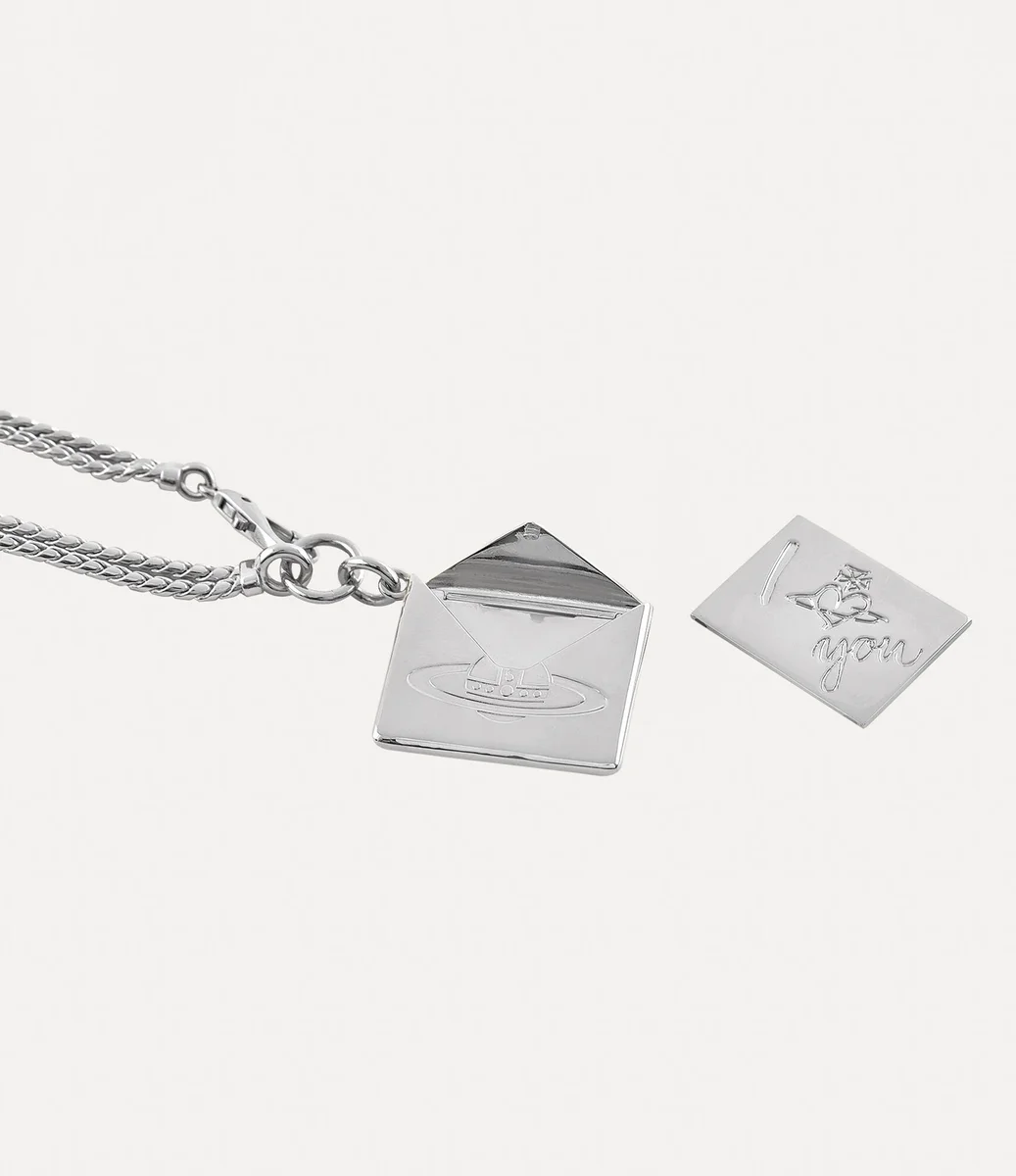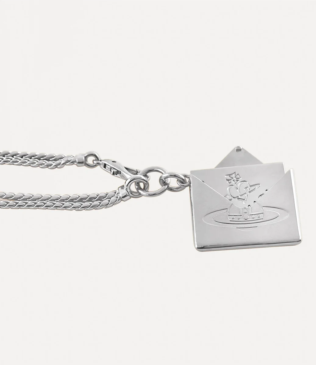 Colierul nostru cu pandantiv plic de Valentine are o siluetă cu lanț dublu realizat din metal placat cu argint, îmbogățit cu detalii de patină neagră. Partea din față prezintă motivul nostru caracteristic orb, un simbol al viziunii Viviennei de a lansa tradiția în viitor, în timp ce partea din spate este gravată cu boutique-ul emblematic Vivienne Westwood. Colierul se deschide pentru a dezvălui o scrisoare turnată în interior, inscripționată cu mesajul sincer „Te iubesc”.