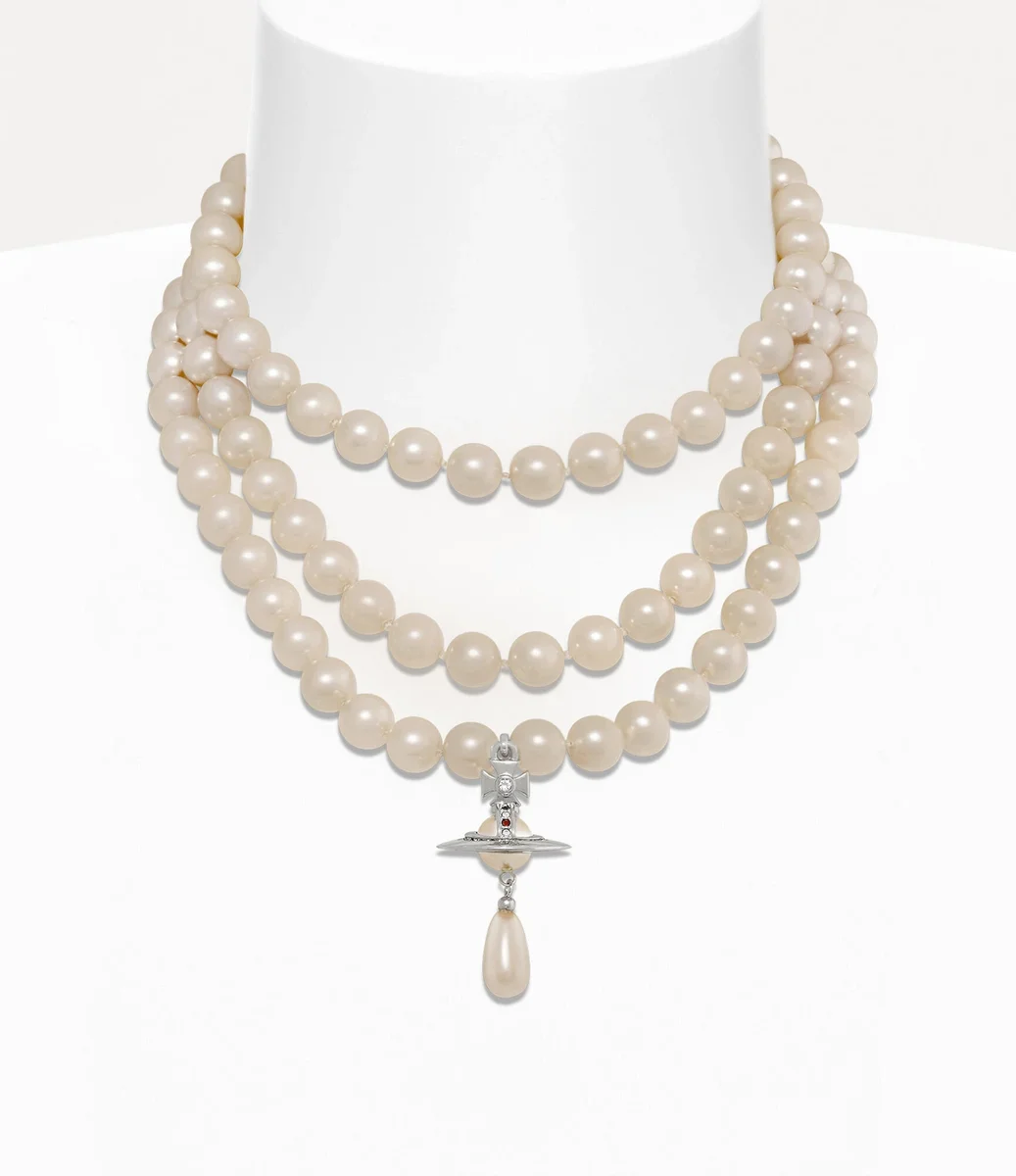 La sfârșitul anilor 1980, Vivienne Westwood și-a prezentat conceptul de perle la prezentarea de modă Harris Tweed Fall 1987, cu un colier triplu. Colierul nostru Three Row Pearl Drop se inspiră din acest design original, oferind un motiv tridimensional în formă de glob, împodobit cu cristale și un detaliu suspendat în formă de lacrimă.