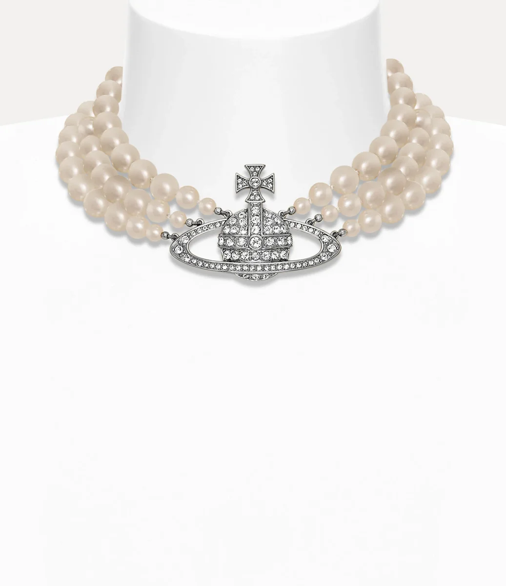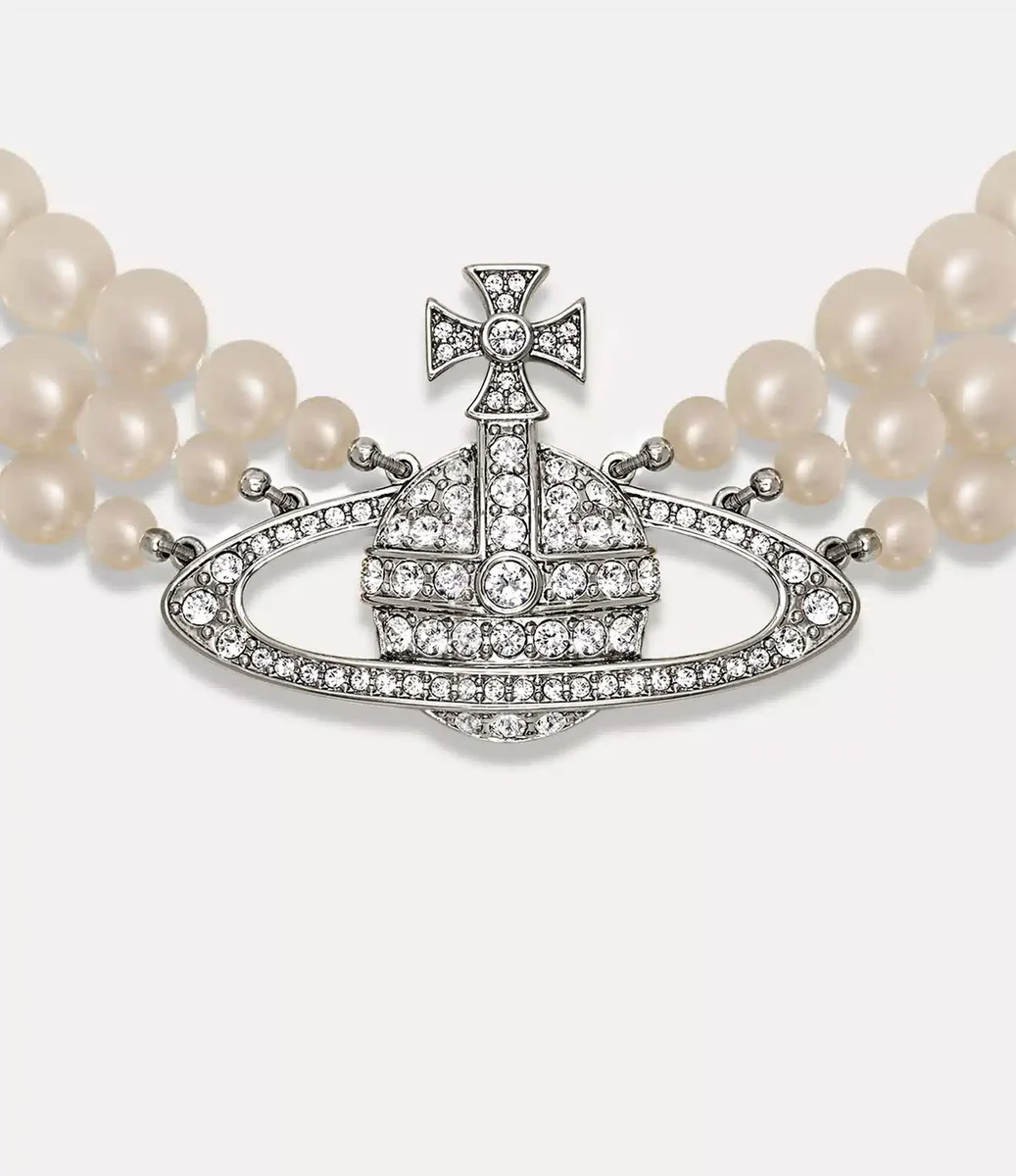 Apărut pentru prima dată în colecția noastră iconică „Portrait” din 1990, colierul cu trei rânduri de perle în basorelief se inspiră din bijuteriile clasice cu perle, incorporând abordarea distinctivă a Viviennei de a fuziona estetica punk cu influențele istorice. Designul prezintă un glob central în basorelief, împodobit cu cristale albe, care întruchipează viziunea casei de a lansa trecutul în viitor.