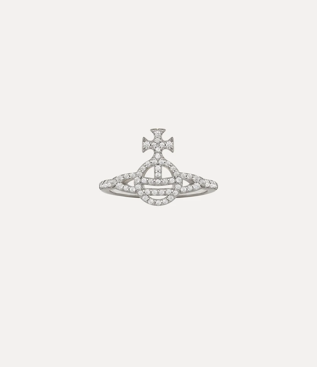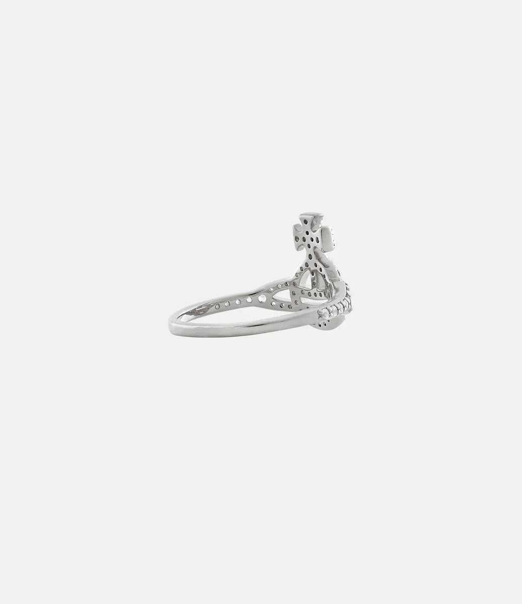 Inelul nostru Calliope are o bandă delicată, împodobită cu cristale pavé în nuanțe de alb, care urmăresc forma motivului globului din fața designului – sinonim cu viziunea Viviennei de a lansa tradiția în viitor. Piesa are detalii gravate în mod complex, completate cu tipografia noastră semnătură pe partea interioară a benzii.