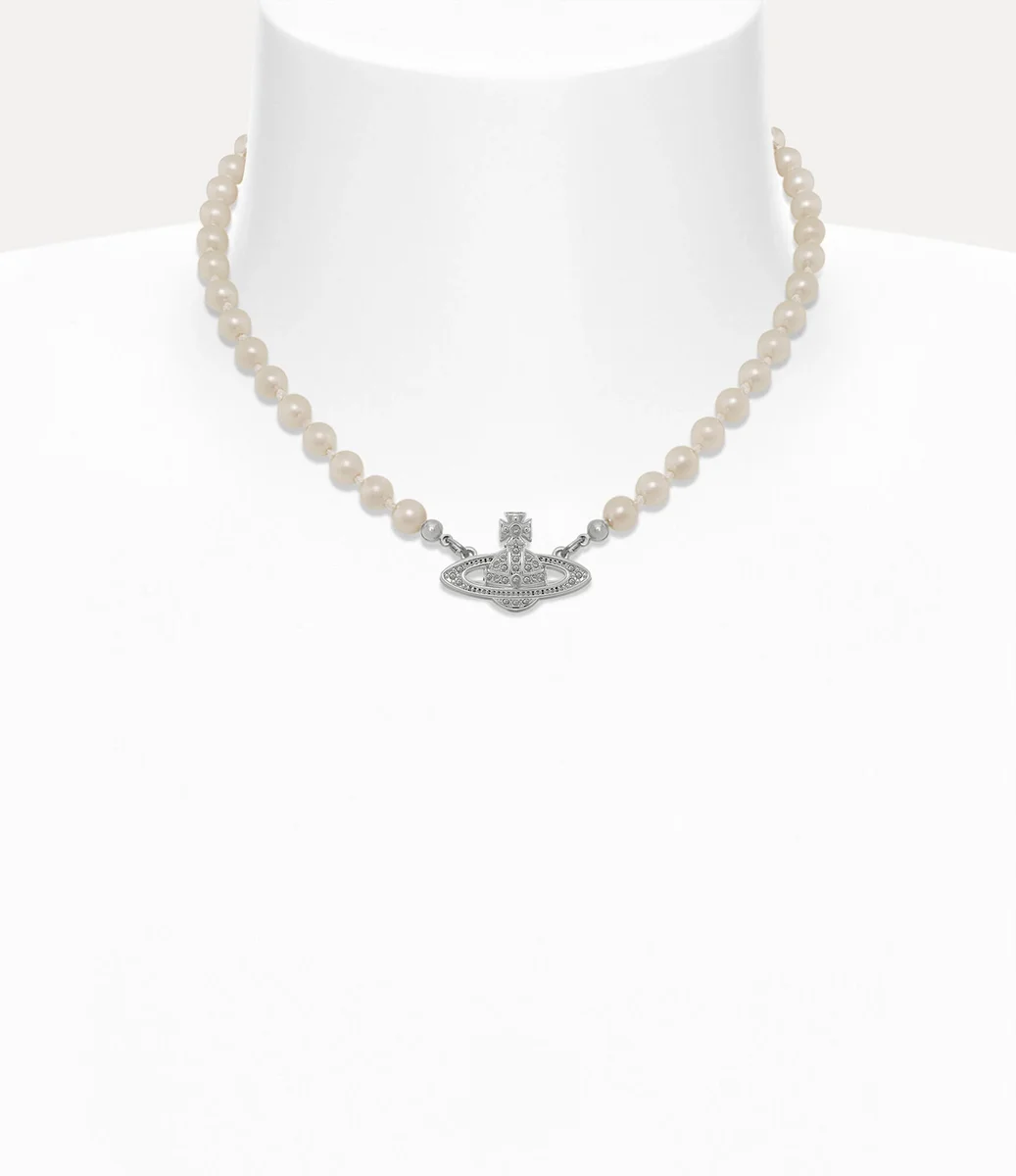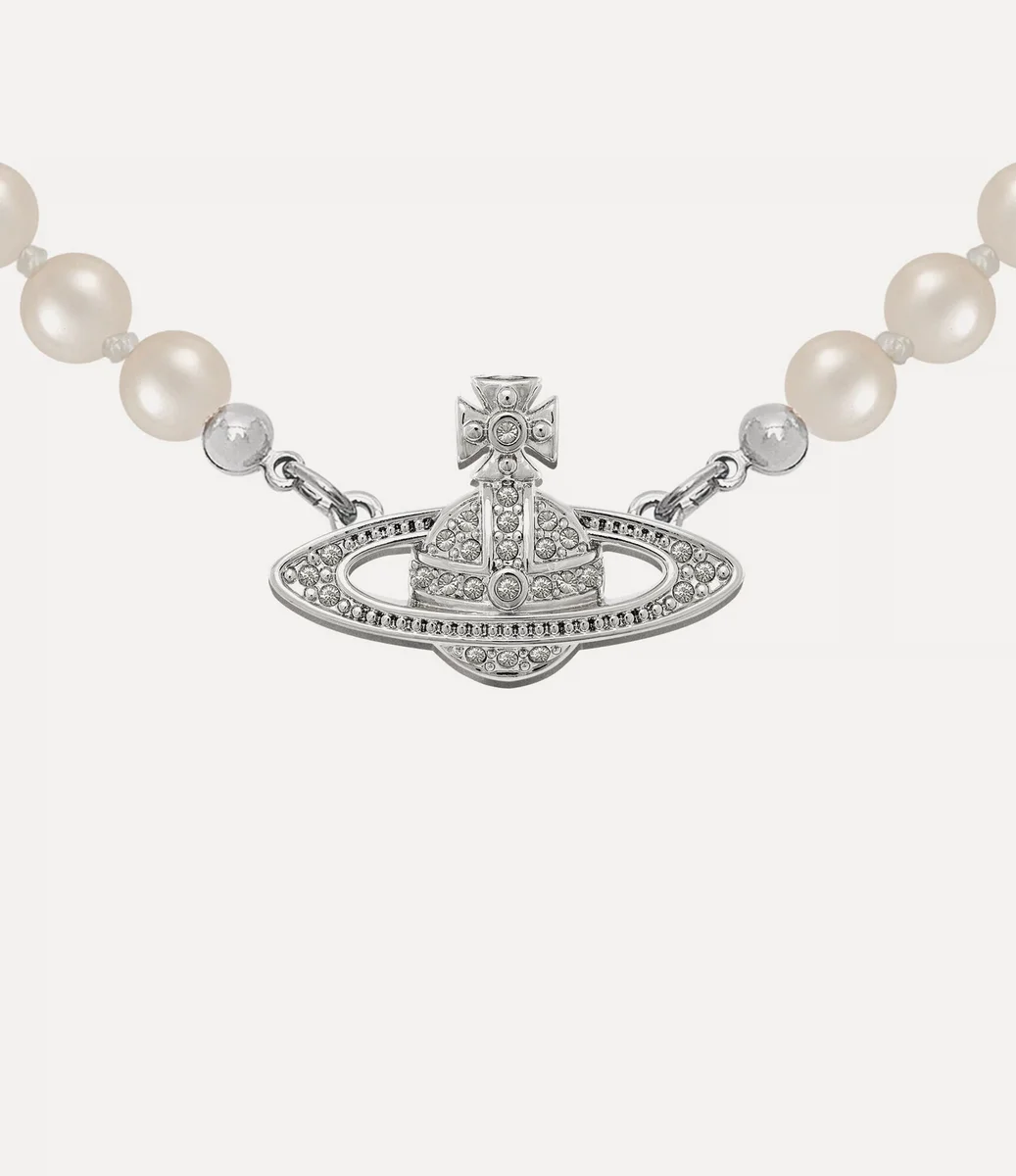 La sfârșitul anilor 1980, Vivienne Westwood a prezentat conceptul său iconic de perle la prezentarea de modă Harris Tweed Fall 1987, cu un colier cu un singur rând. Colierul nostru Mini Bas Relief Pearl se inspiră din acest design original, reinterpretându-l cu motivul clasic orb în centru, pus în valoare de cristale strălucitoare – amintind de etosul casei de a lega trecutul de viitor.