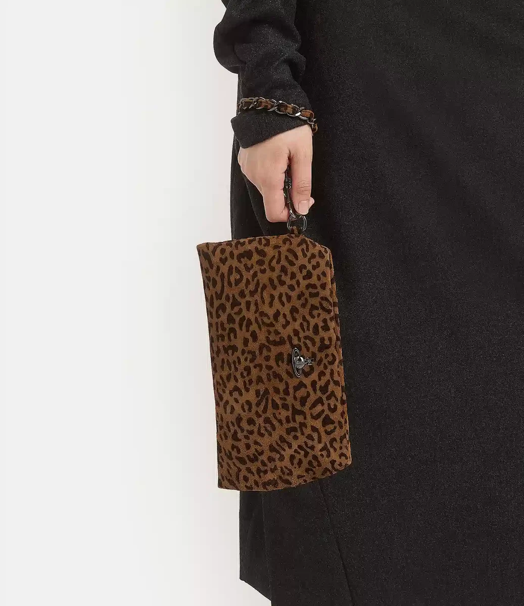 Punga de mână Sadie a fost reinventată într-o versiune din piele de căprioară moale, cu imprimeu leopard, completată de o siluetă dreptunghiulară ușor căptușită. Designul prezintă un lanț argintiu împletit cu piele de căprioară asortată, finisat cu un glob basorelief lustruit în partea din față.