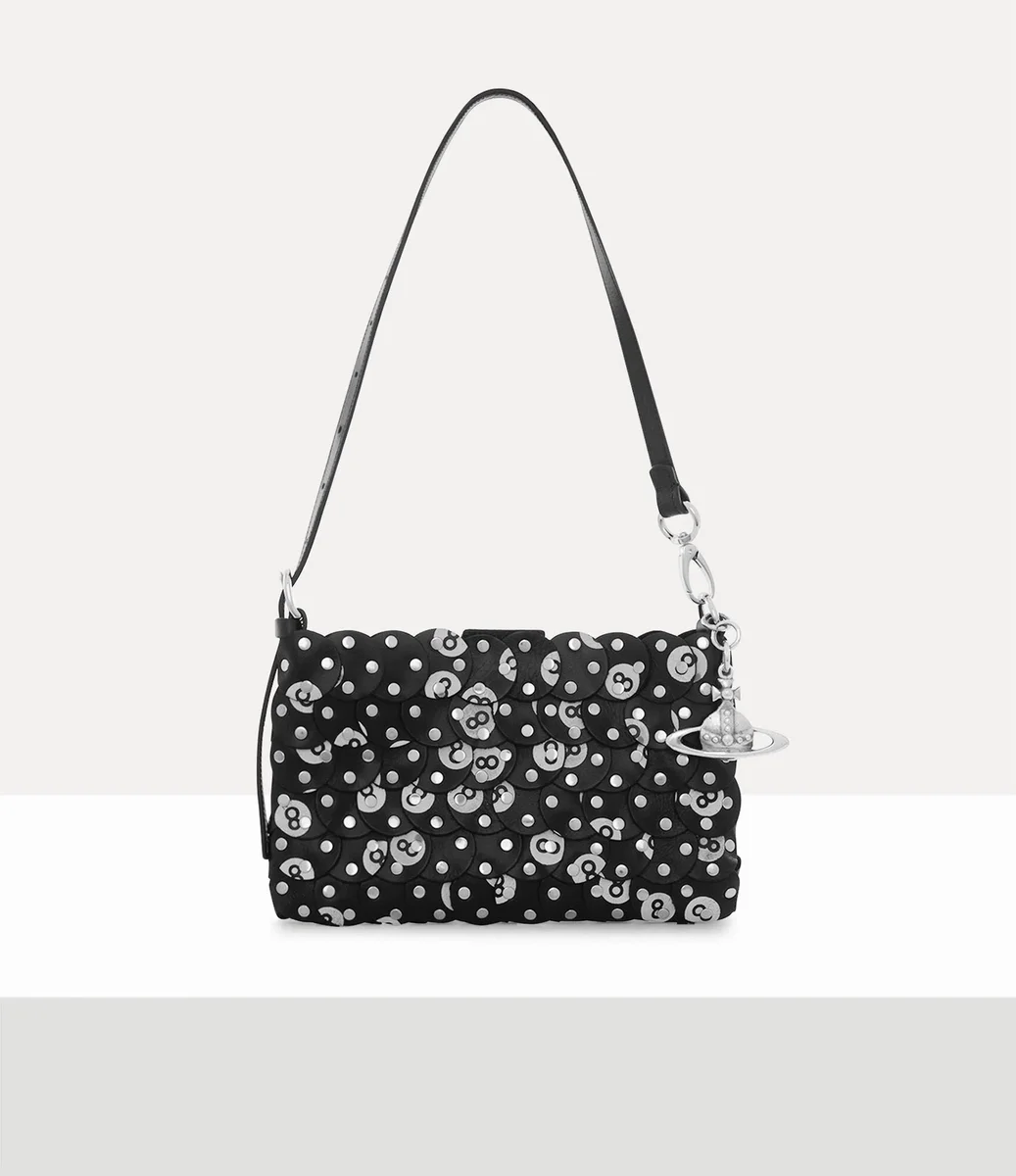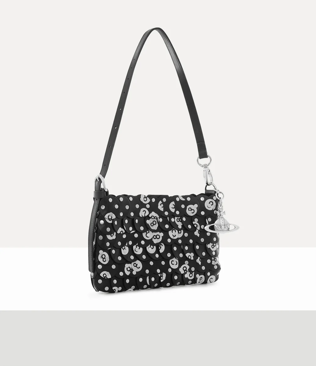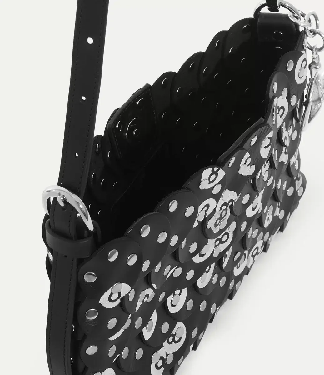 Geanta de umăr Lola, creată în colaborare cu Ethical Fashion Initiative pentru colecția noastră Made in Kenya, se inspiră din imprimeurile vintage de bingo și biliard. Silueta este realizată din cercuri de piele tăiate manual, împodobite cu ținte argintii „8 Ball” aplicate manual.