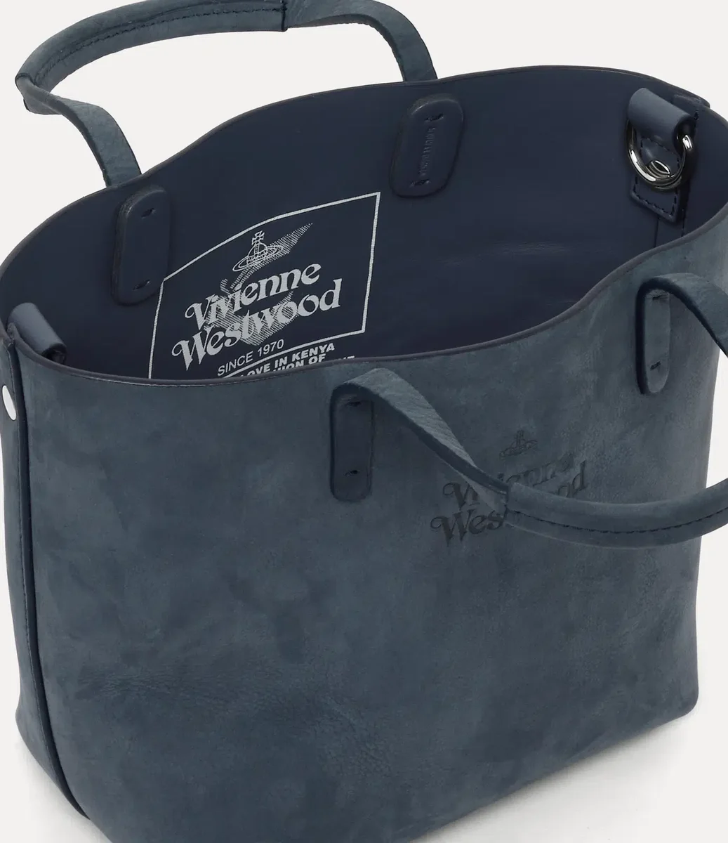 Geanta noastră Studio Small Shopper face parte din colecția Made in Kenya, realizată în colaborare cu Ethical Fashion Initiative. Piesa are un finisaj din piele nubuc albastră și prezintă un panou frontal în relief, completat cu motivul orb și literele semnătura casei.