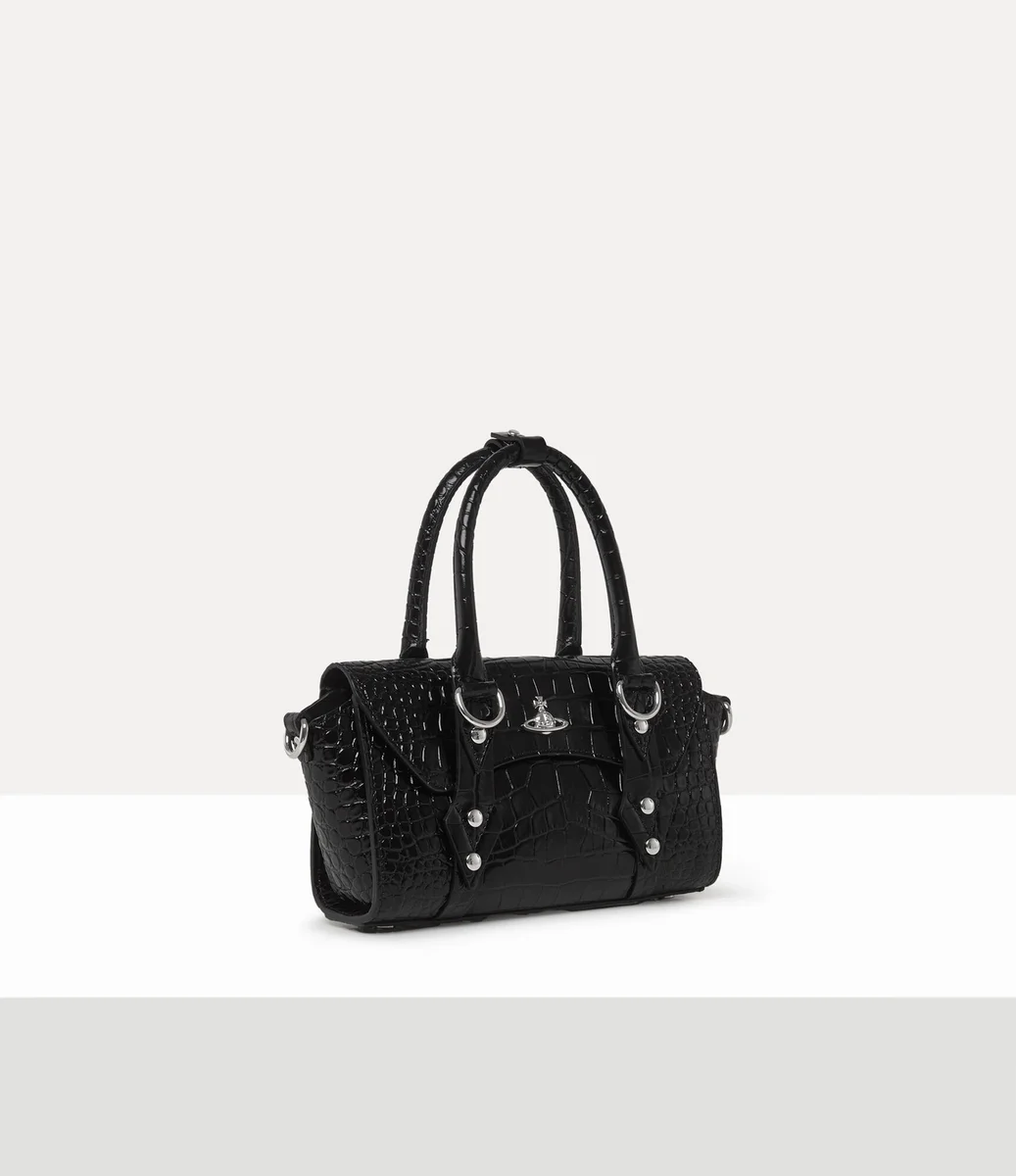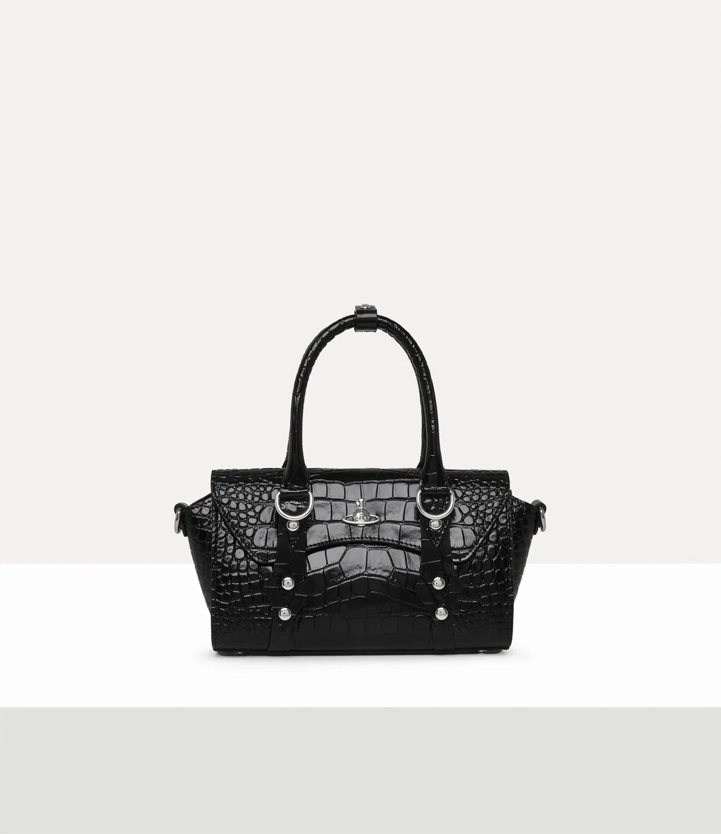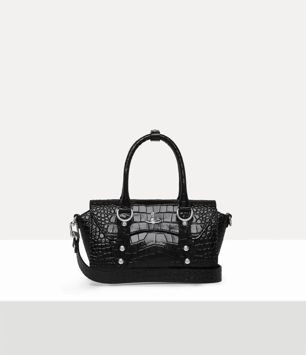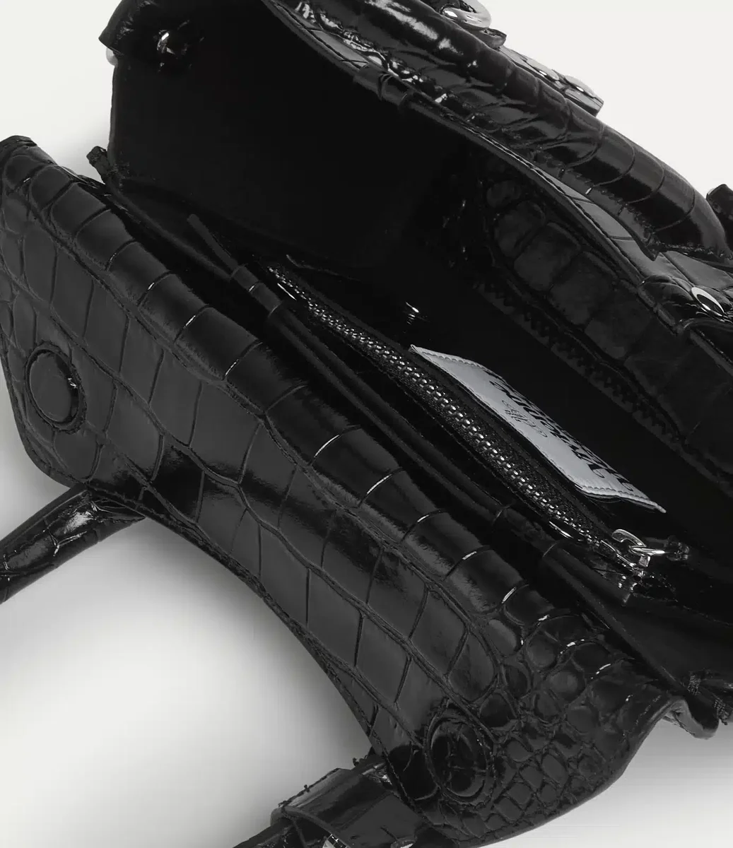 În acest sezon, geanta noastră emblematică Bettina Mini crossbody este confecționată din piele moale, cu un finisaj complex, în relief, cu efect de crocodil. Inspirat de gama „Betty” a casei, designul este detaliat cu accesorii metalice inspirate din stilul bondage și un inel D argintiu pentru charmuri personalizabile.