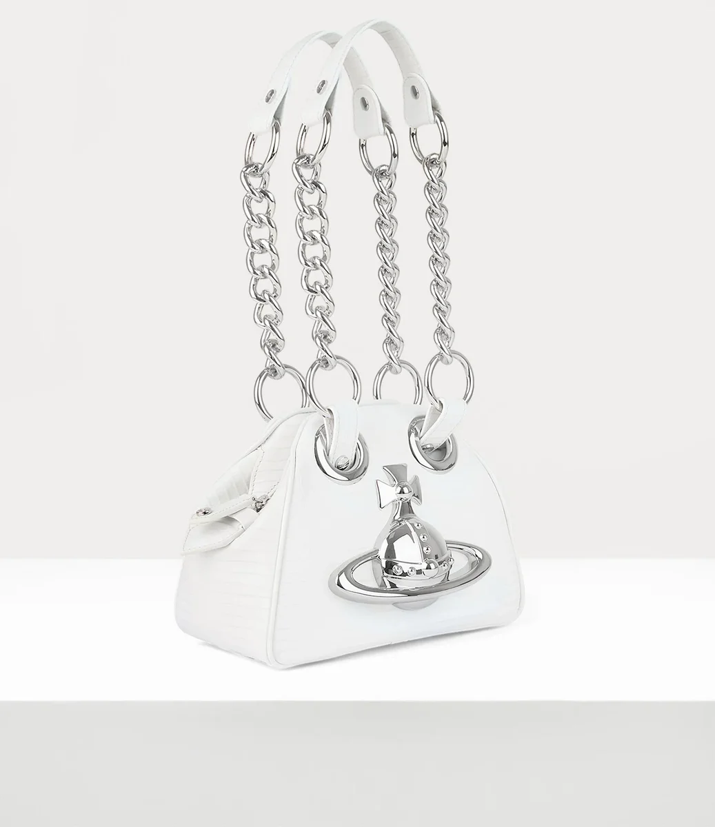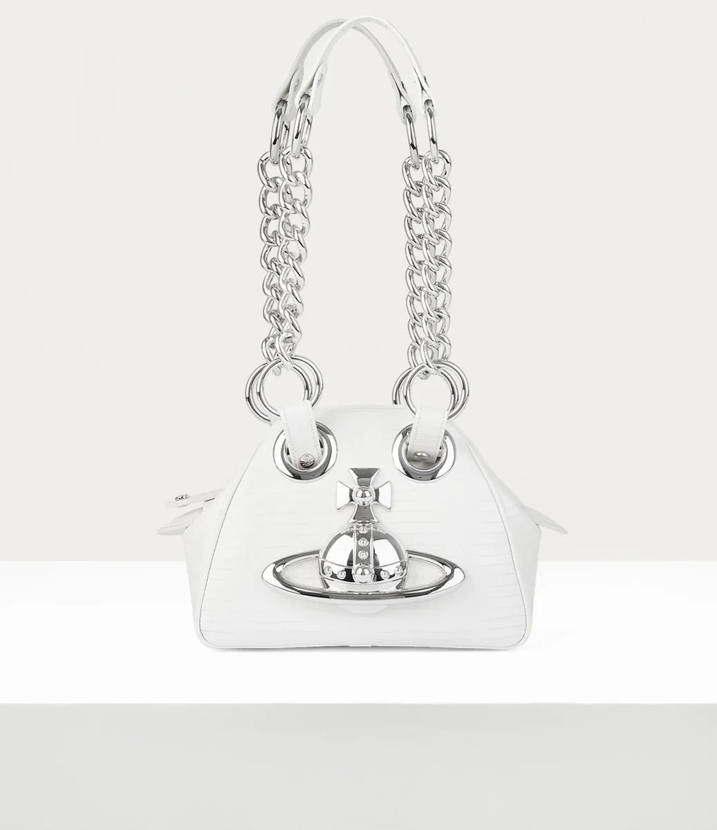 Geanta noastră Archive Orb Chain, apărută pentru prima dată în colecția Vivienne Westwood Primăvară-Vară 1991 „Cut, Slash & Pull”, a fost reinterpretată în acest sezon în piele embosată cu efect de crocodil „Mini”. Piesa prezintă un motiv tridimensional mare în formă de glob pe panoul frontal, completat cu cercuri inspirate din stilul bondage și detalii din lanțuri de-a lungul curelelor.