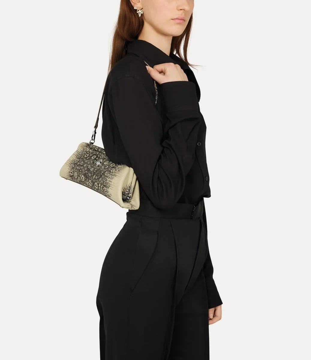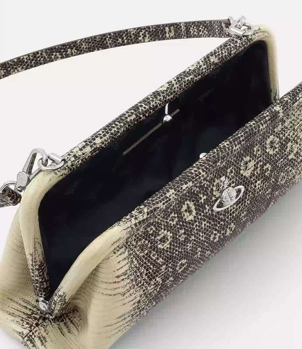Poșeta Jane Frame se inspiră din stilul iconic „Granny” al casei, evocând poșetele pentru monede din secolul al XX-lea, cu structura lustruită expusă și închizătoarea cu clichet. Confecționată din piele, poșeta prezintă motivul embosat cu efect de șopârlă spălată, specific sezonului, și o siluetă alungită.