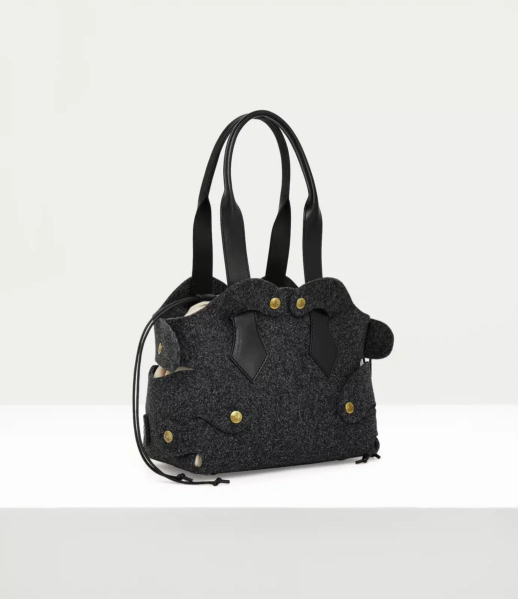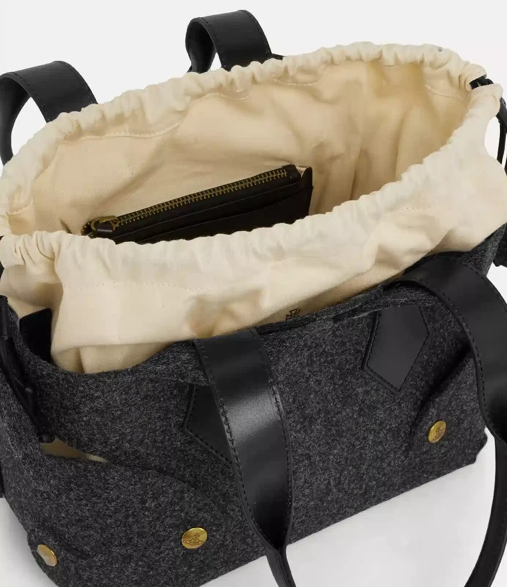 Geanta mică Vivienne Westwood Wilma este confecționată din pâslă groasă de lână și are un sistem modular cu capse și mânere caracteristice în formă de vârf de lance.