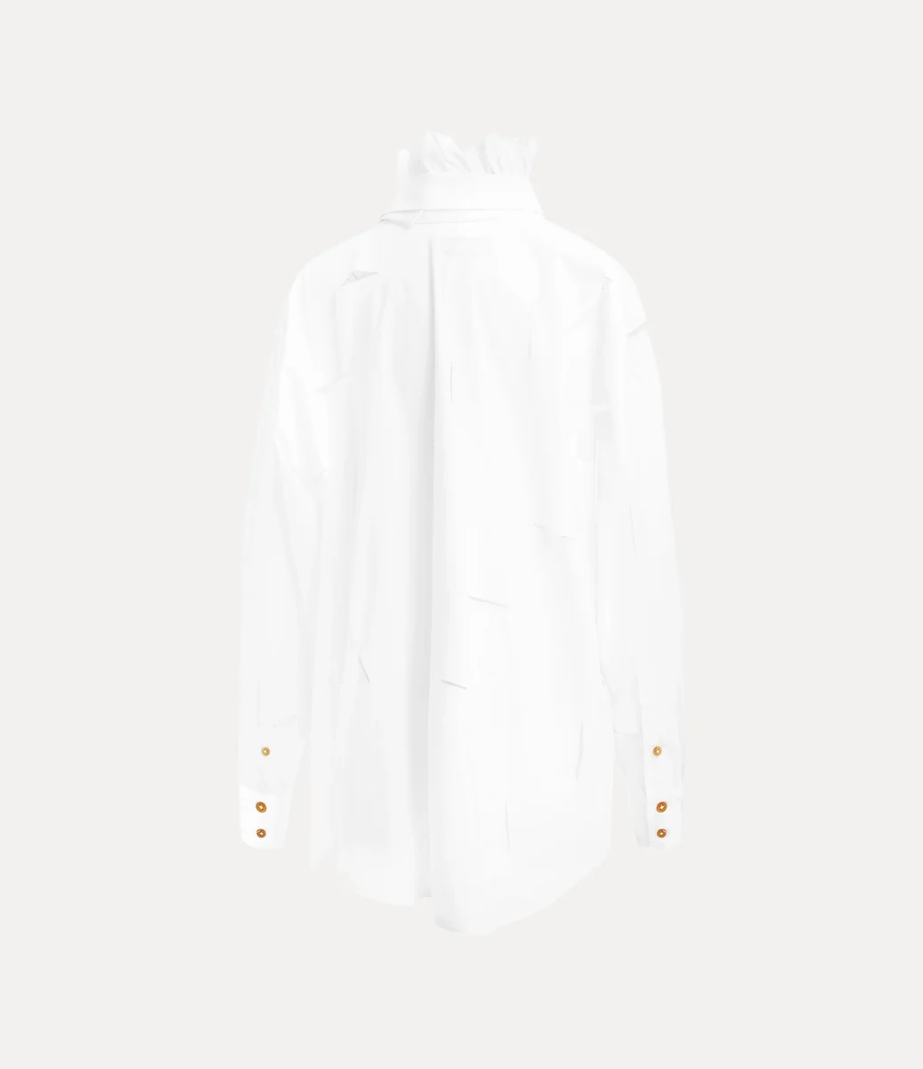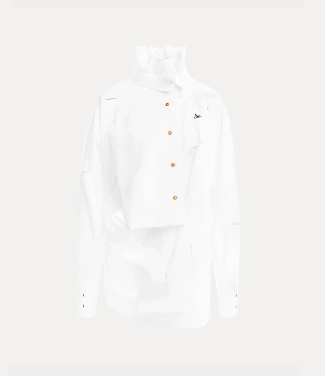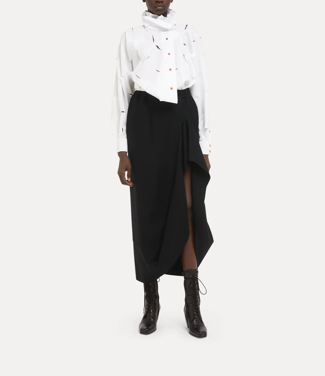 Inspirată de portretele Tudor, bluza noastră Halston oferă un guler înalt cu volane, fixat cu o închidere cu două nasturi. Draperiile moi și sculpturale cad elegant pe corp, în timp ce detaliile complexe în formă de tăieturi împodobesc designul – un element caracteristic introdus pentru prima dată în colecția Vivienne Westwood Primăvară-Vară 1991, „Cut, Slash and Pull”.