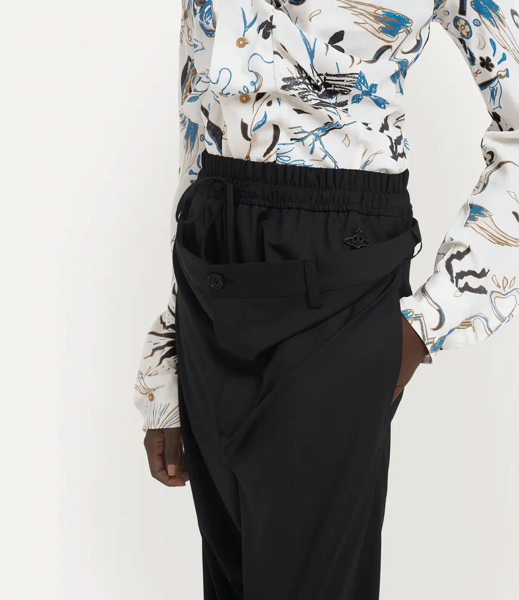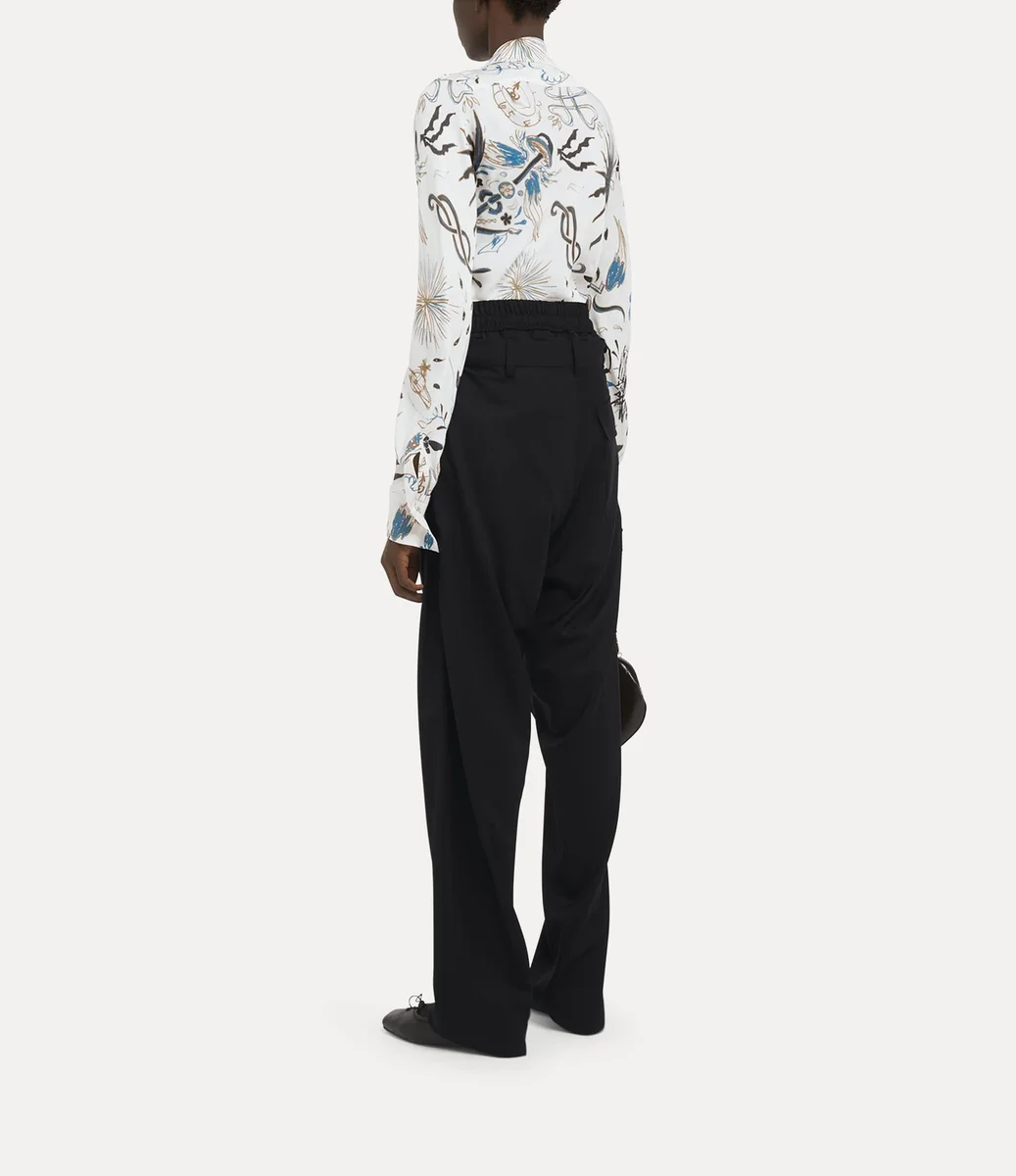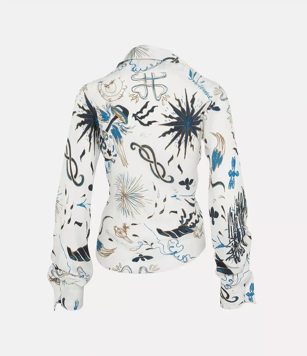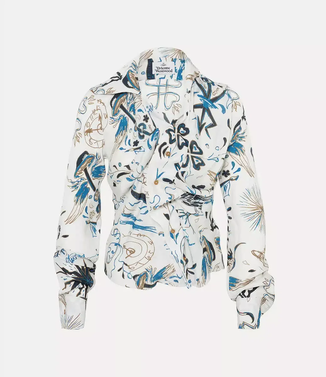 Concepută cu sistemul experimental de croială Drunken al Vivienne, cămașa noastră Drunken are o placketă descentrată și un tiv asimetric. Inspirată de „The Laughing Cavalier” de Frans Hals, piesa este imprimată cu un design grafic abstract care încorporează iconografia caracteristică a casei.